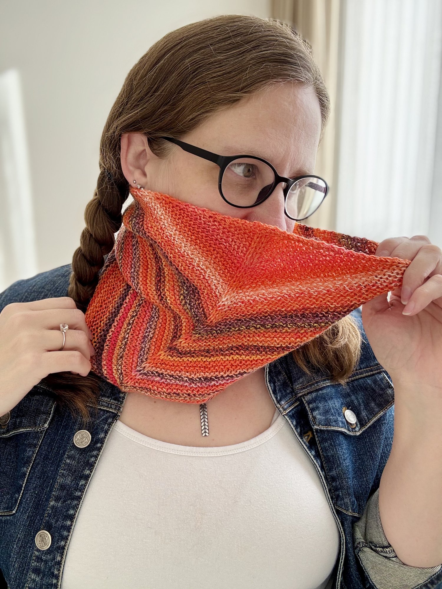 A bias-knit garter stitch cowl designed to allow color-changing or handspun yarns to shine