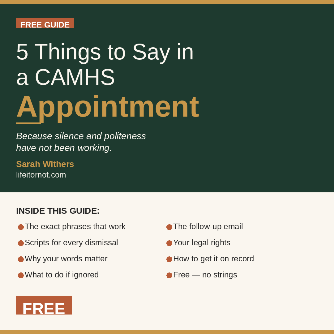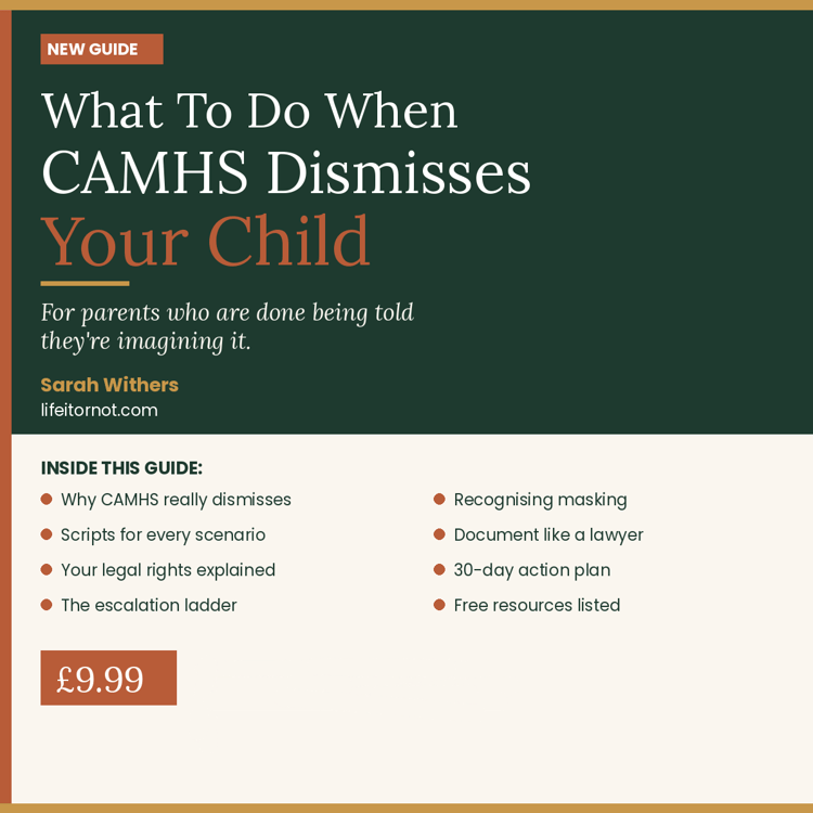 If you find it useful, the next step is: 'What To Do When CAMHS Dismisses Your Child' - available on Payhip or at lifeitornot.com.