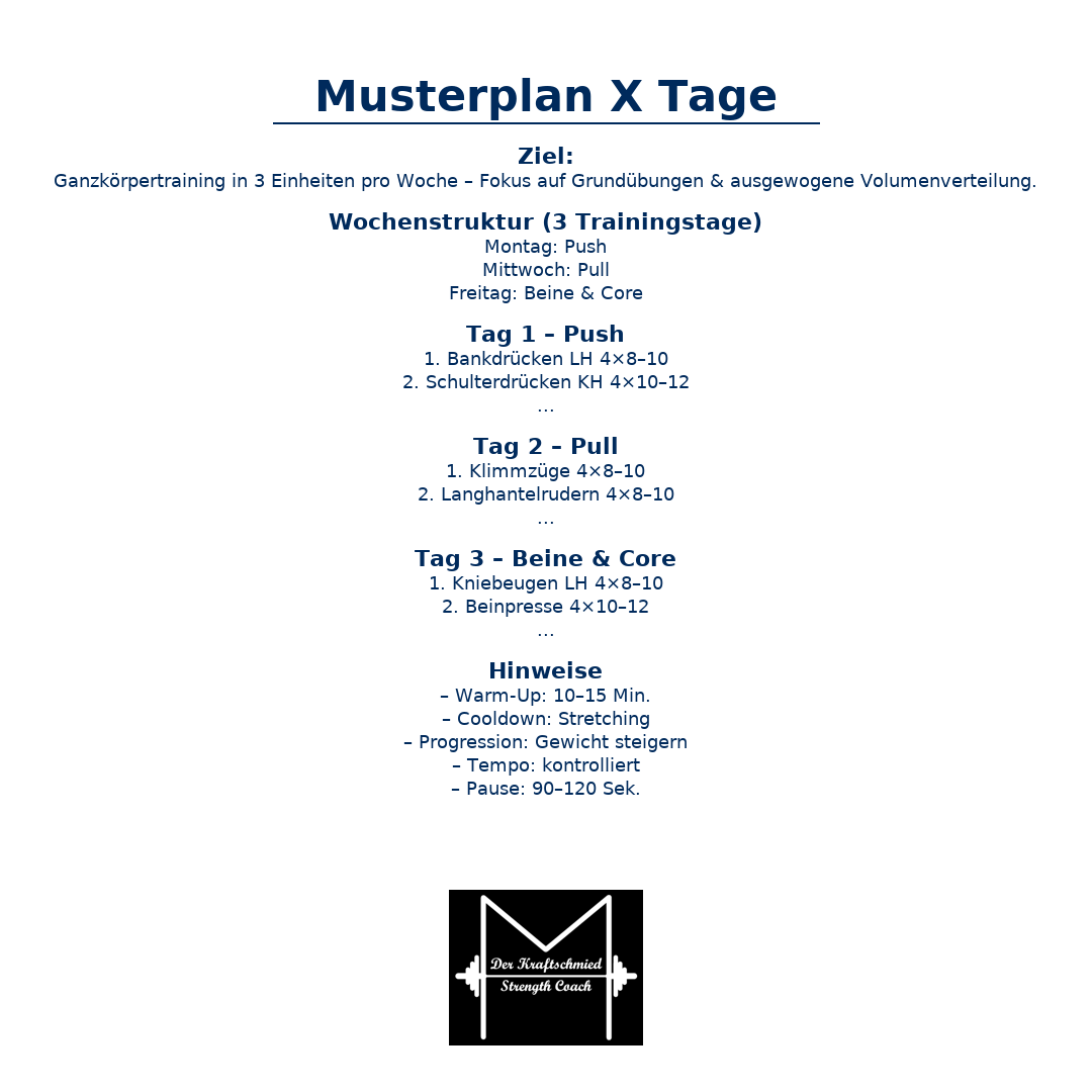 - 3 strukturierte Workouts pro Woche (Push / Pull / Beine & Core)