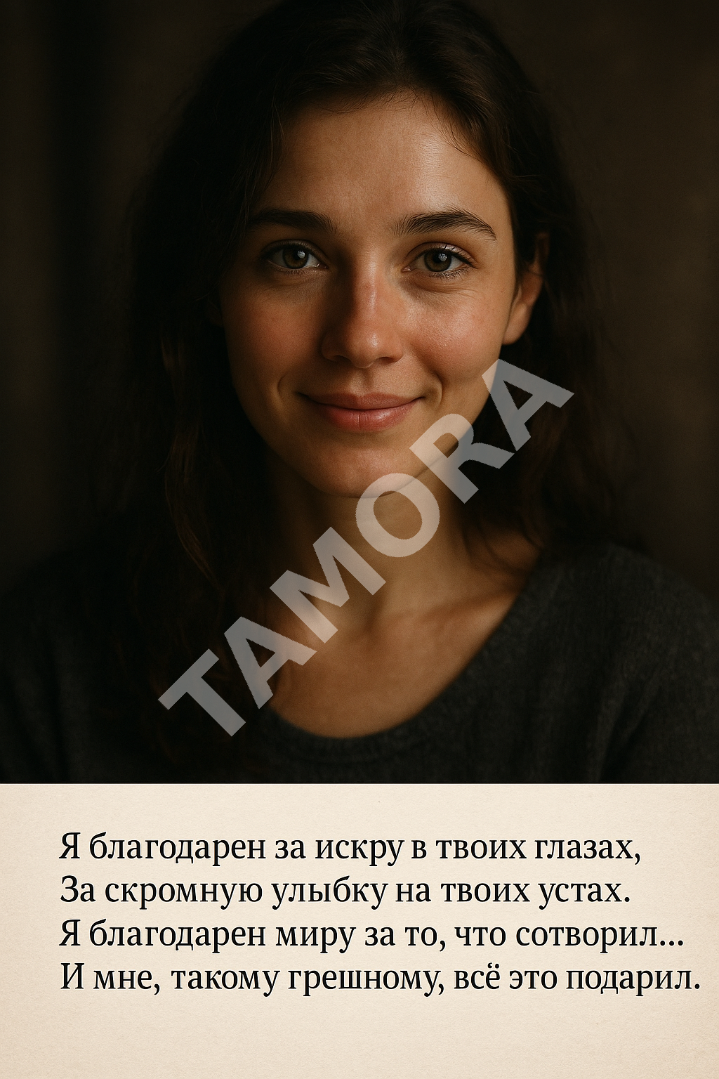 Эта цифровая открытка сочетает в себе аутентичное русскоязычное стихотворение и фирменный водяной знак «TAMORA», обеспечивая защиту интеллектуальной собственности и узнаваемость бренда. Дизайн выполнен в строгом, но эмоционально выразительном стиле, идеально подходящем для персональных посланий.