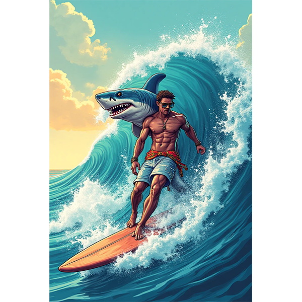 Featuring a fearless surfer facing off with a monstrous shark, this 90x60 print captures motion, danger, and raw energy in one unforgettable scene.