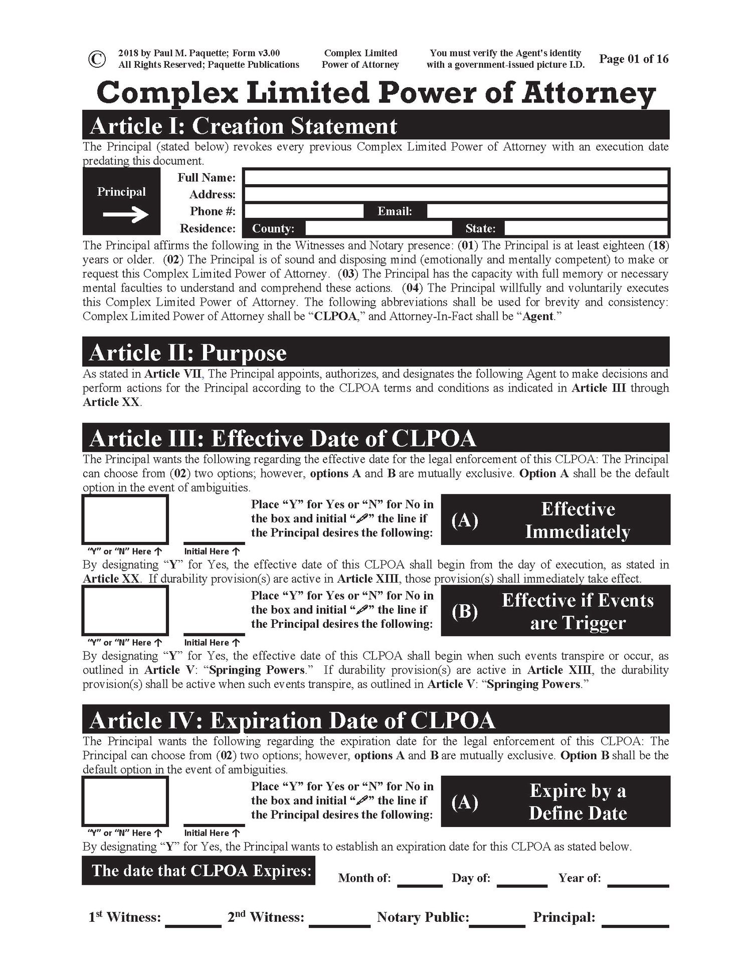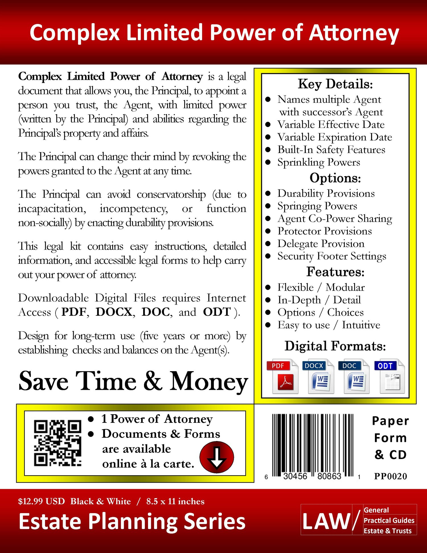 Complex Limited Power of Attorney is a legal document that allows you, the Principal, to appoint a person you trust, the Agent, with limited powers (written by the Principal) and abilities regarding the Principal’s property and affairs.