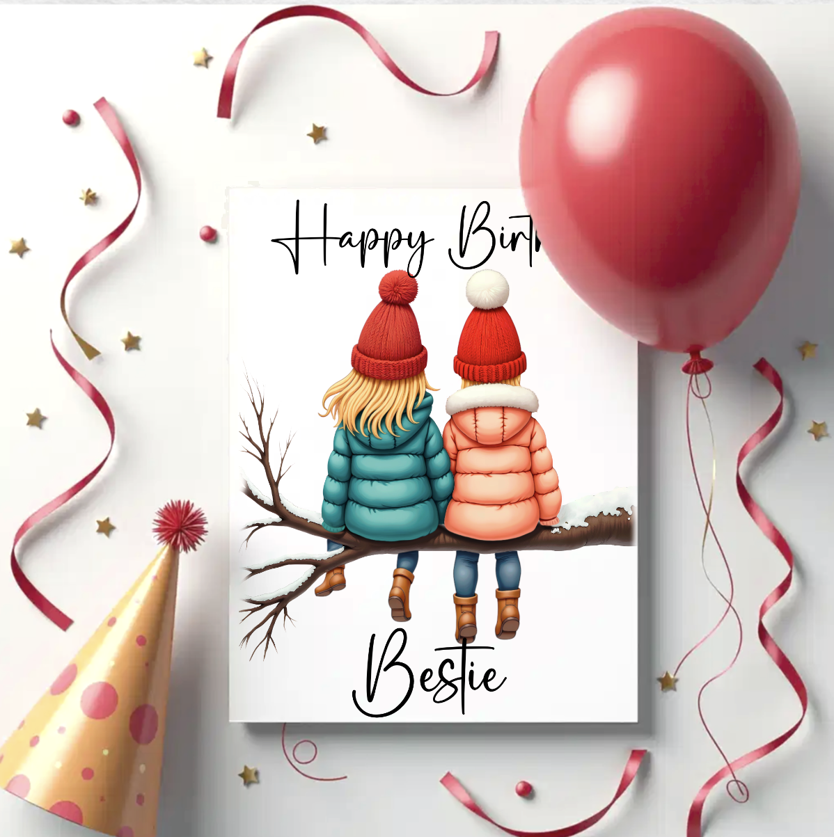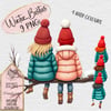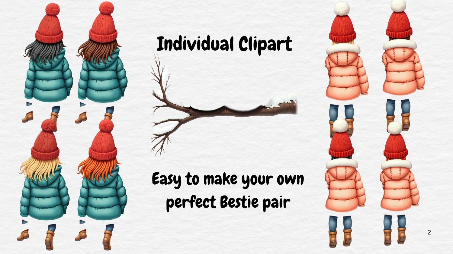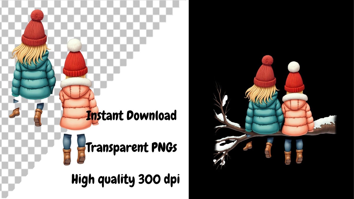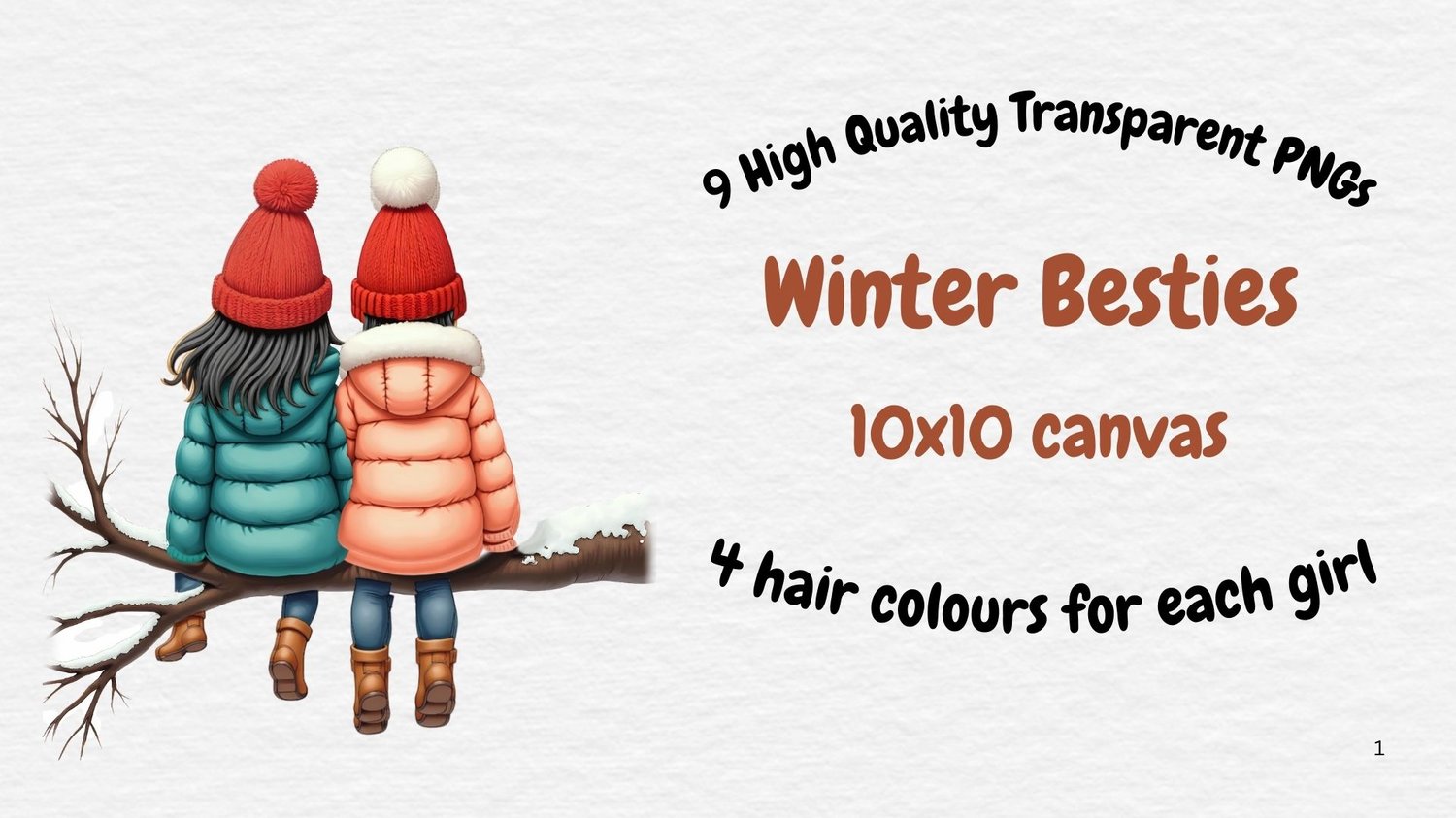 Winter Besties. Includes log, 4 right girls, 4 left girls. Blonde, Titian, brunette, black hair. 9 PNGs. DTF, UVDTF etc. Sublimation, Print, DTF etc. Personalise, customise