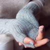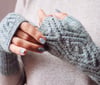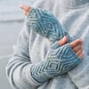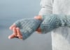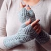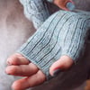 Knit in fingering weight, these mittens are a perfect project for that special skein of sock yarn. The cabled pattern at the back of the hand and stretchy ribs at the palm and thumbs make the mittens fit snugly and comfortably. Cozy fabric keeps your hands warm, while the fingerless design leaves fingers free to work on another project or browse on your phone. The cabled panel opens up beautifully when worn with a bit of negative ease. Instructions are both written and charted.