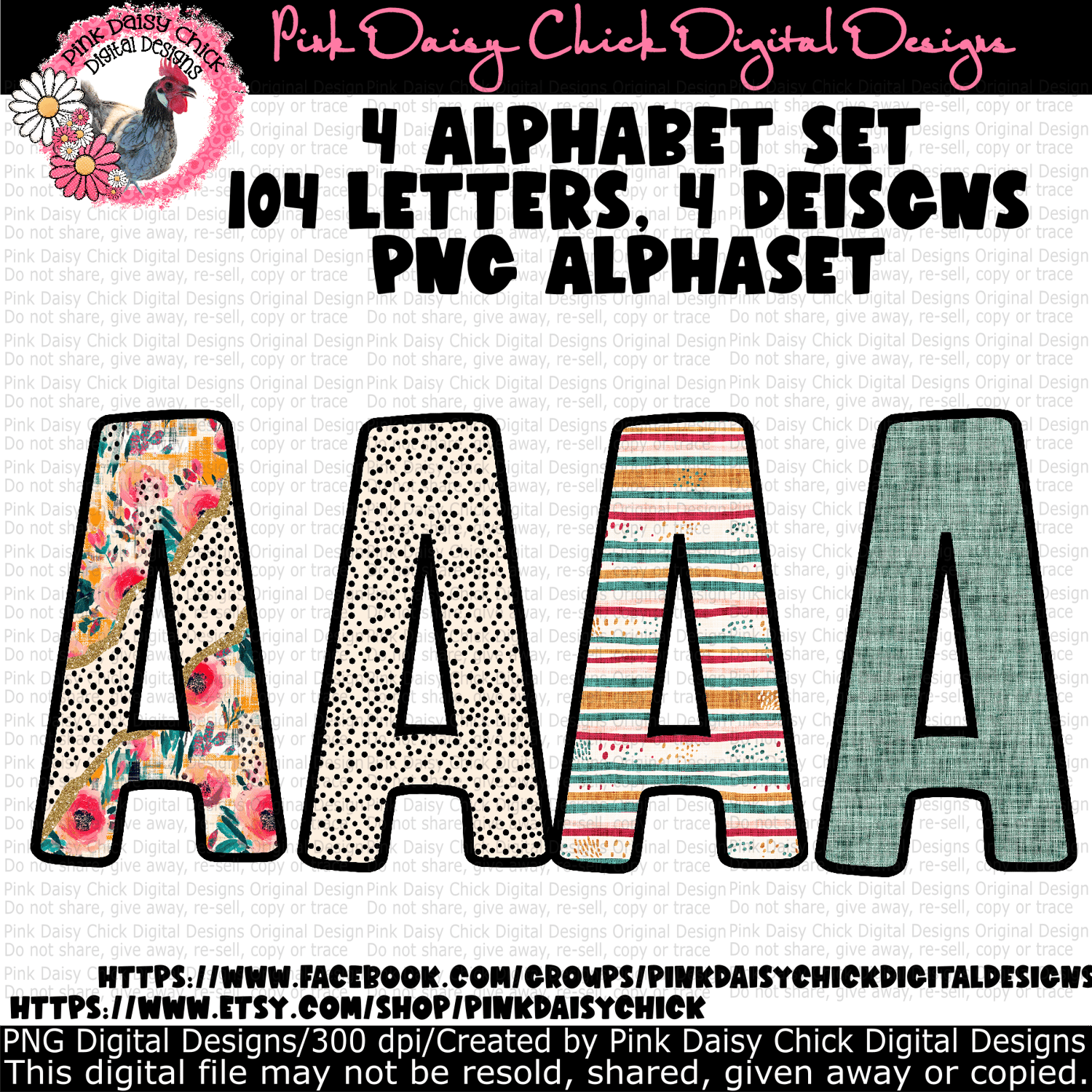 4 design PNG Alphaset, 104 letters Floral Dots Stripes Solid
