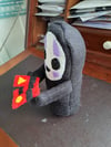 No Face's mask is hand stitched from felt, his body is black polar fleece and his tokens are felt. Stuffed with polyester and plastic beans so he can stand up on his own, this lil buddy just wants someone to love