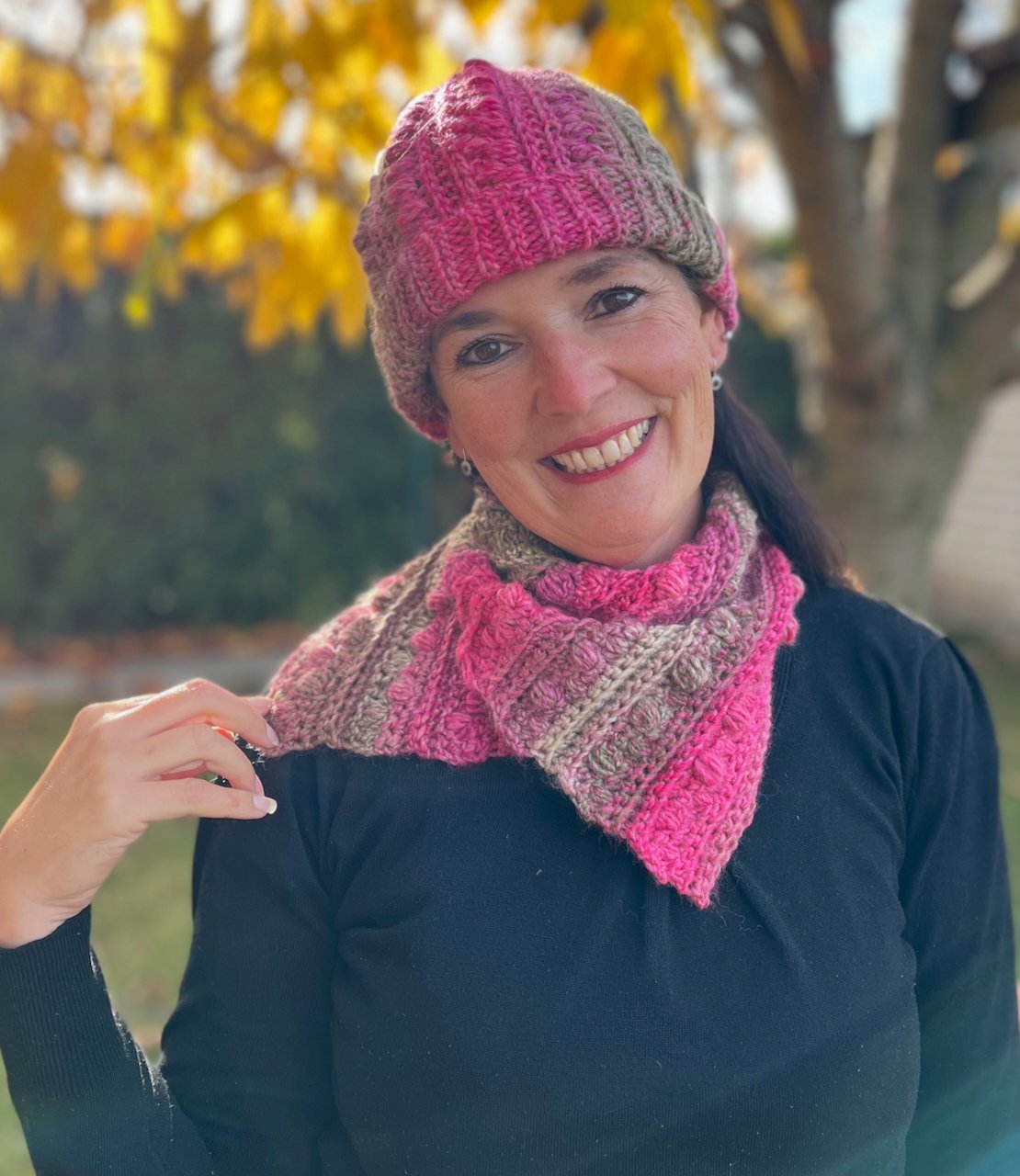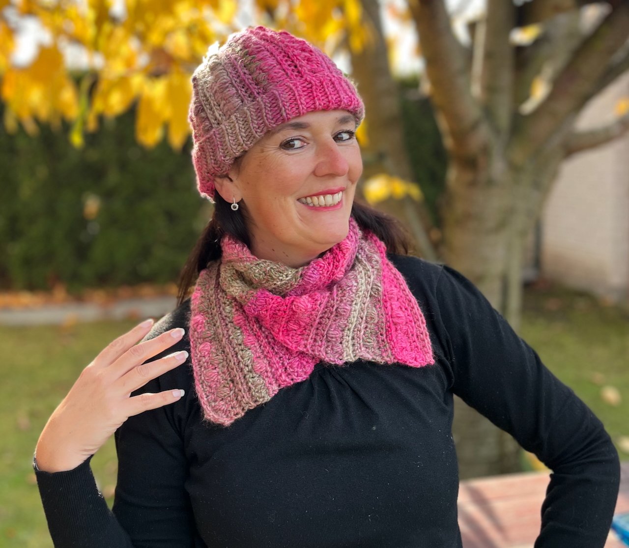 Tento nákrčník je navržen tak, aby tvořil dokonalý set s háčkovanou čepicí. Používám stejnou, příjemnou vlněnou a hřejivou přízi (Samba) a háček, avšak vzor jsem upravila tak, aby byl méně hutný a přesto příjemně hřejivý.