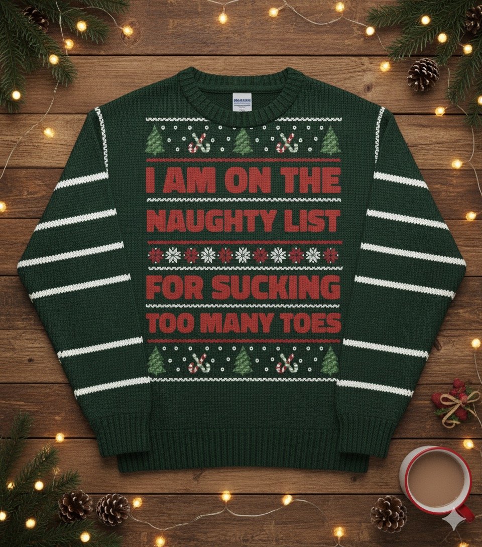Win your next holiday party with this hilarious and wildly inappropriate "I AM ON THE NAUGHTY LIST FOR SUCKING TOO MANY TOES" cut file. This design features a classic Fair Isle sweater aesthetic combined with modern, bold text, making it perfect for custom apparel and crafting.