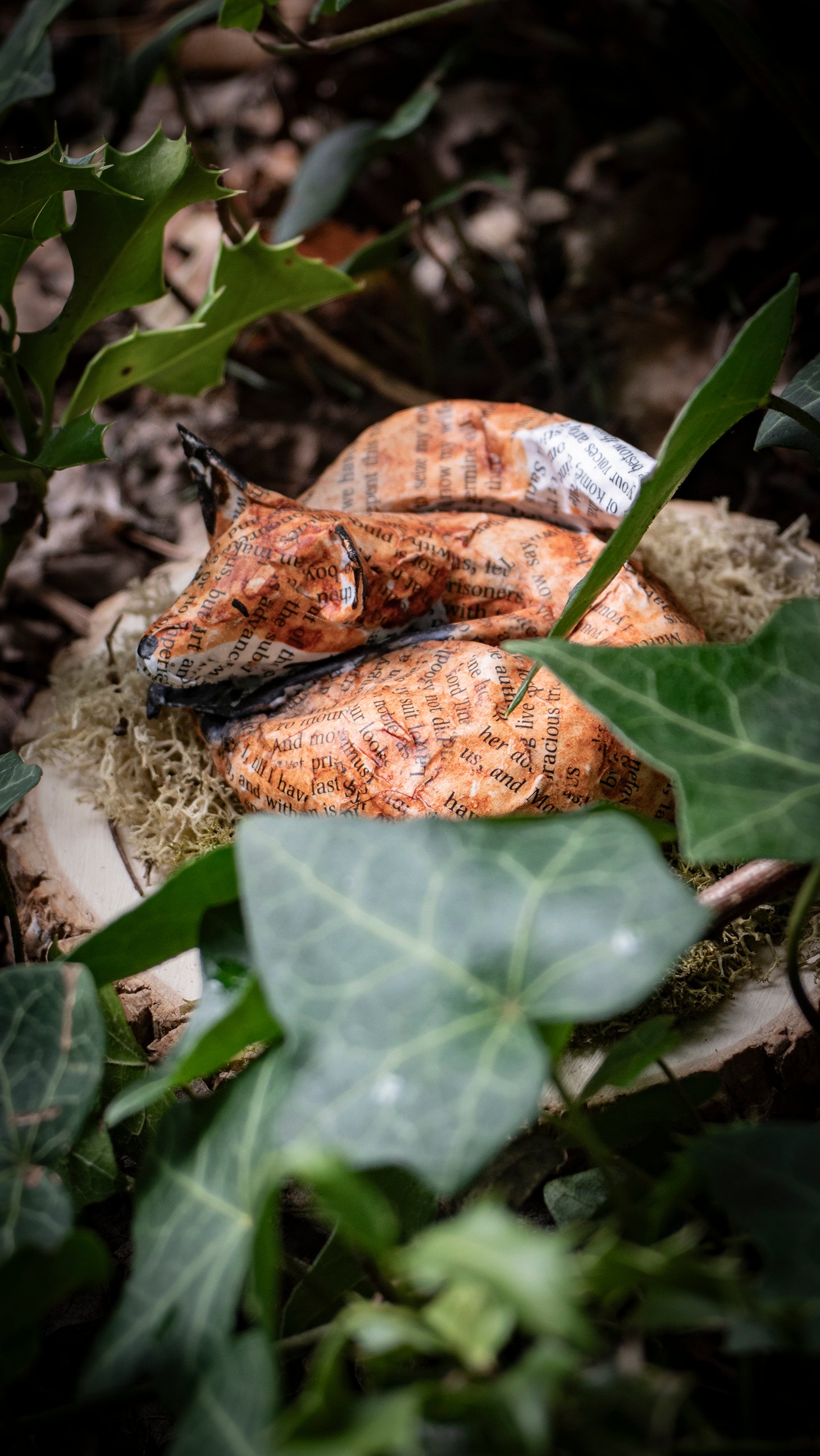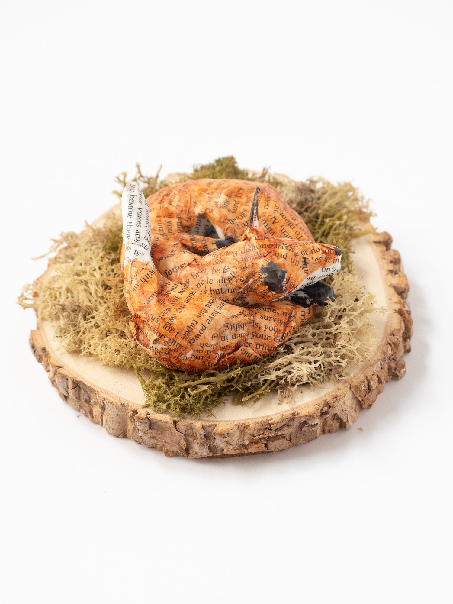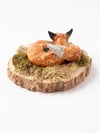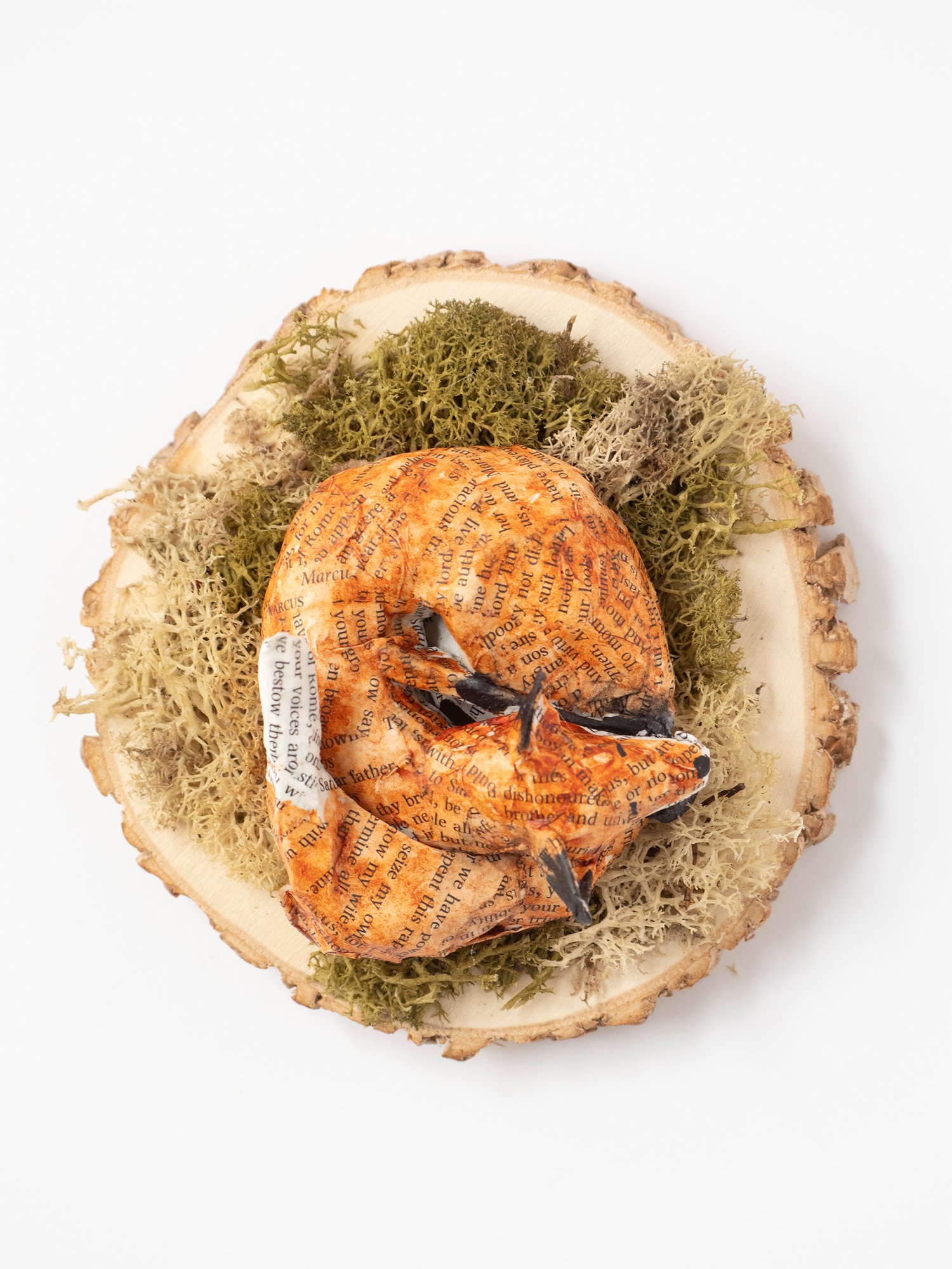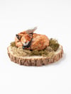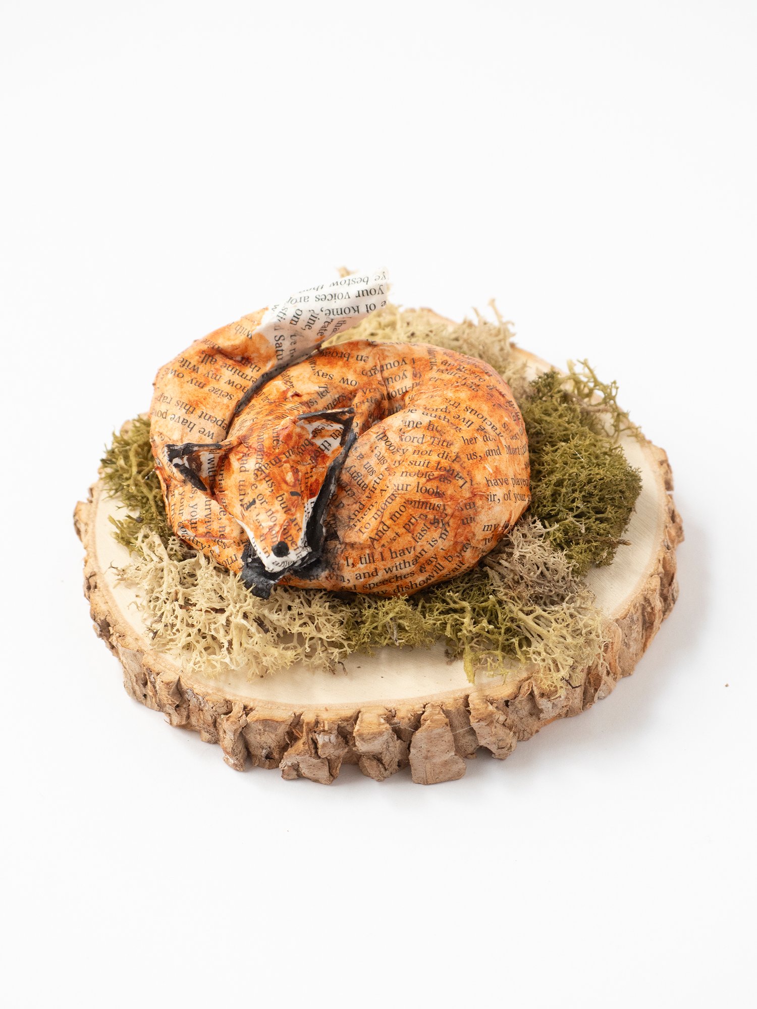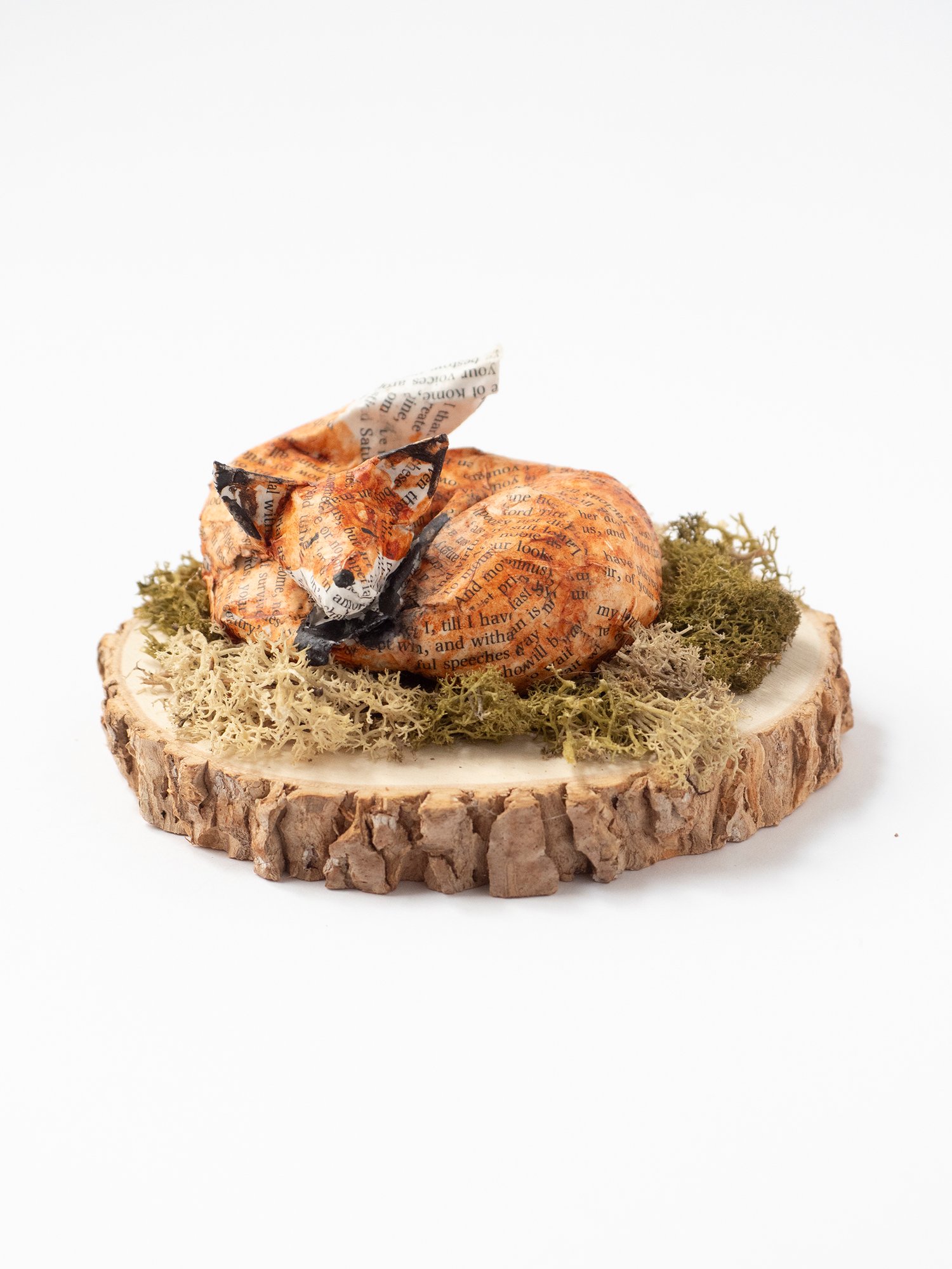 A handmade paper mache folk art sculpture of a sleeping fox in moss on a small wooden base. It is created from paper mache using book paper, wire and watercolour and is approx 5cm high x 11cm wide. Made with newspaper, wire, glue, pages from Shakespeare, and watercolour paint.