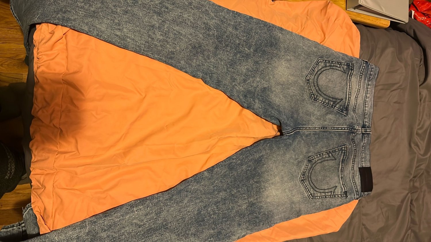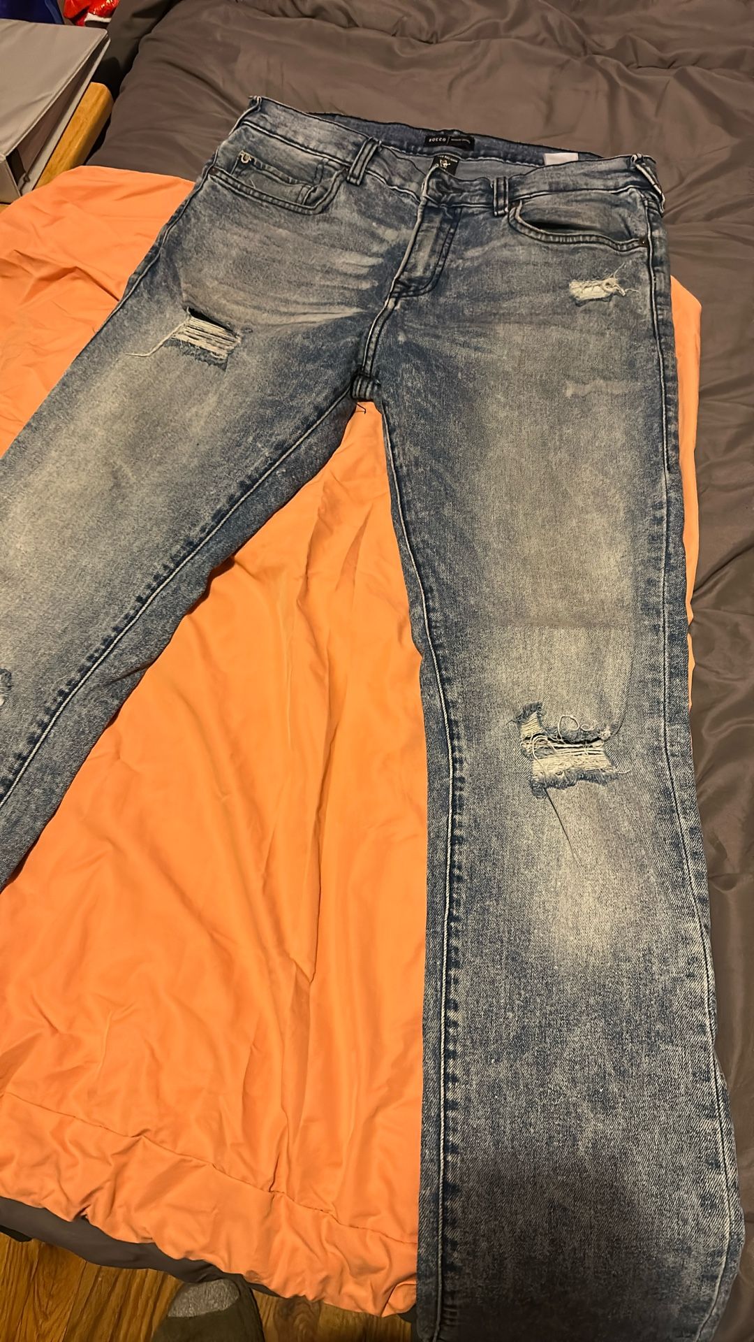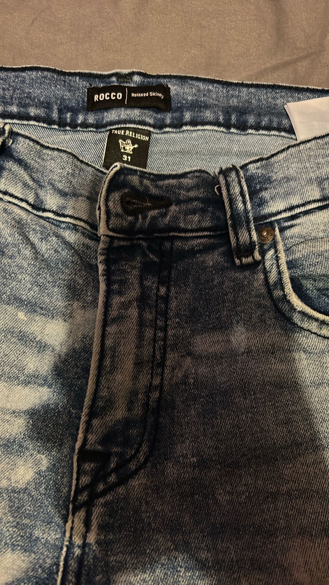 True Religion Rocco Relaxed Skinny jeans. Here is a detailed description: Brand and Style: The jeans are made by the brand True Religion. The specific style is "Rocco Relaxed Skinny". Size: The size indicated on the tag is 31. Color and Wash: The jeans have a blue base color with a prominent acid-wash or stone-wash finish. This gives them a distressed, faded appearance with lighter blue and white areas contrasting with darker blue and black areas, particularly around the seams and fly area. Design Details: They feature standard five-pocket styling, belt loops, and visible stitching. The front closure appears to be a zipper fly with a button at the waistband.