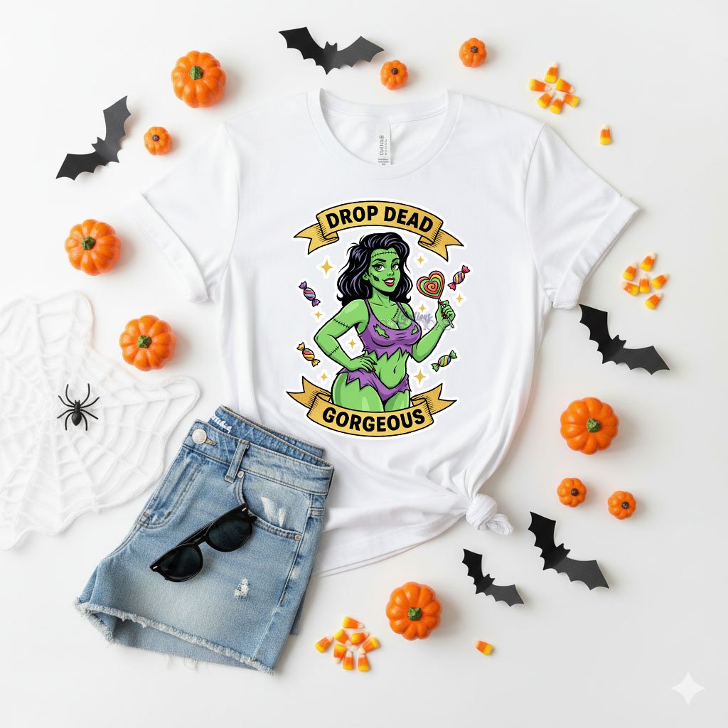 Drop-dead gorgeous 💀 The Zombie Snack shirt shows off a cheeky zombie pin-up with candy accents and the banner “DROP DEAD GORGEOUS.” A fun twist on classic Halloween style.