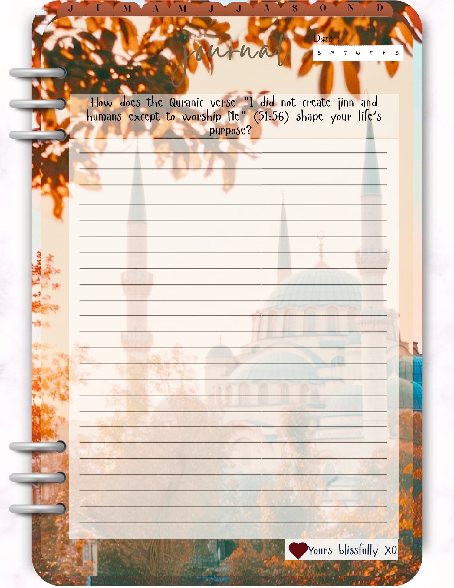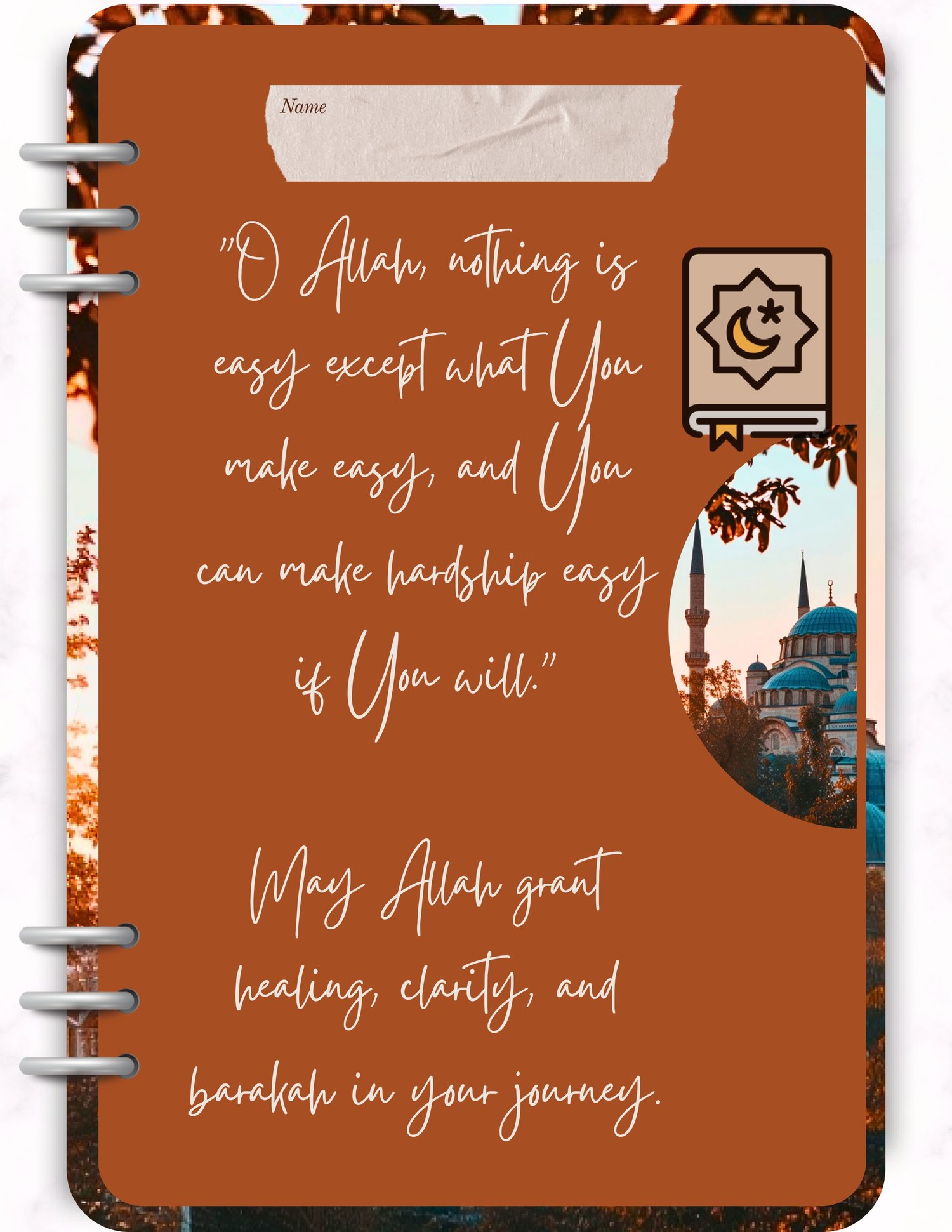This Dated Mental Health Digital Islamic Journal 2026 is made of Daily reflection prompts based on Islamic teachings, Duas, and verses for comfort and strength, Mindfulness activities with an Islamic belief.
