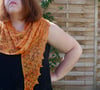 Il a une forme de triangle asymétrique, basée sur le système augmentation en début de rang diminution en fin de rang pour lui donner une jolie courbe. La dentelle grossit au fur et à mesure qu’on avance sur le châle pour l’appréhender doucement mais surement.