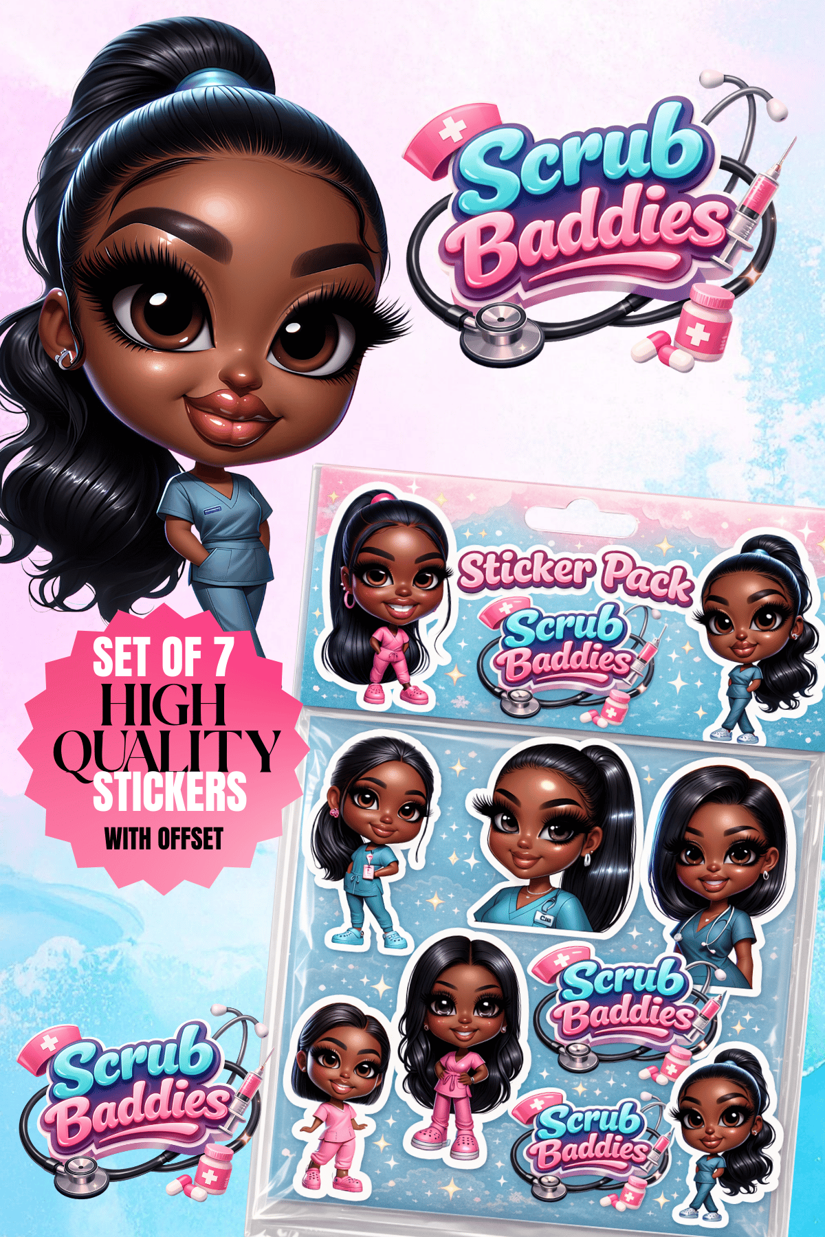 Scrub Baddies 2 Chibi Black Girl Stickers – 7 High-Quality PNGs + 1 Logo Images