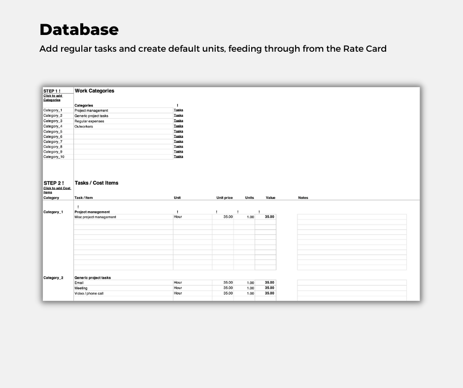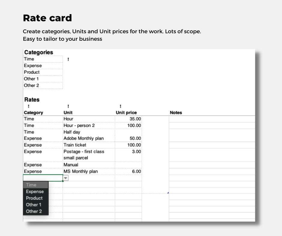 -Set up rates for hours, days, however you charge for your work and that of any collaborators. Examples of categories and rates shown in the visuals can be replaced with your own