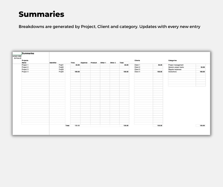 -See the total value of the work add up with every new entry, and be presented according to the relevant project, client and category of work.