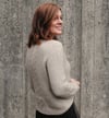 This garment is worked top-down, mainly in the round. After the neckband, right and left saddle shoulders are worked flat. Stitches are then picked up along each side of each saddle shoulder piece to form the front and back of the garment. Short row shaping is worked where each saddle shoulder joins the neckband, to create a sloped shoulder and to maintain the curve of the neckband. The garment is then worked in the round, with increases used to shape the sleeves, front and back. Once armscye depth is reached, sleeve stitches are put on hold, length is added to the back (if needed), then front and back are joined to form the body. Body and sleeves are each worked in the round. Throughout the garment, textured panels are worked down the front, back and sleeves.