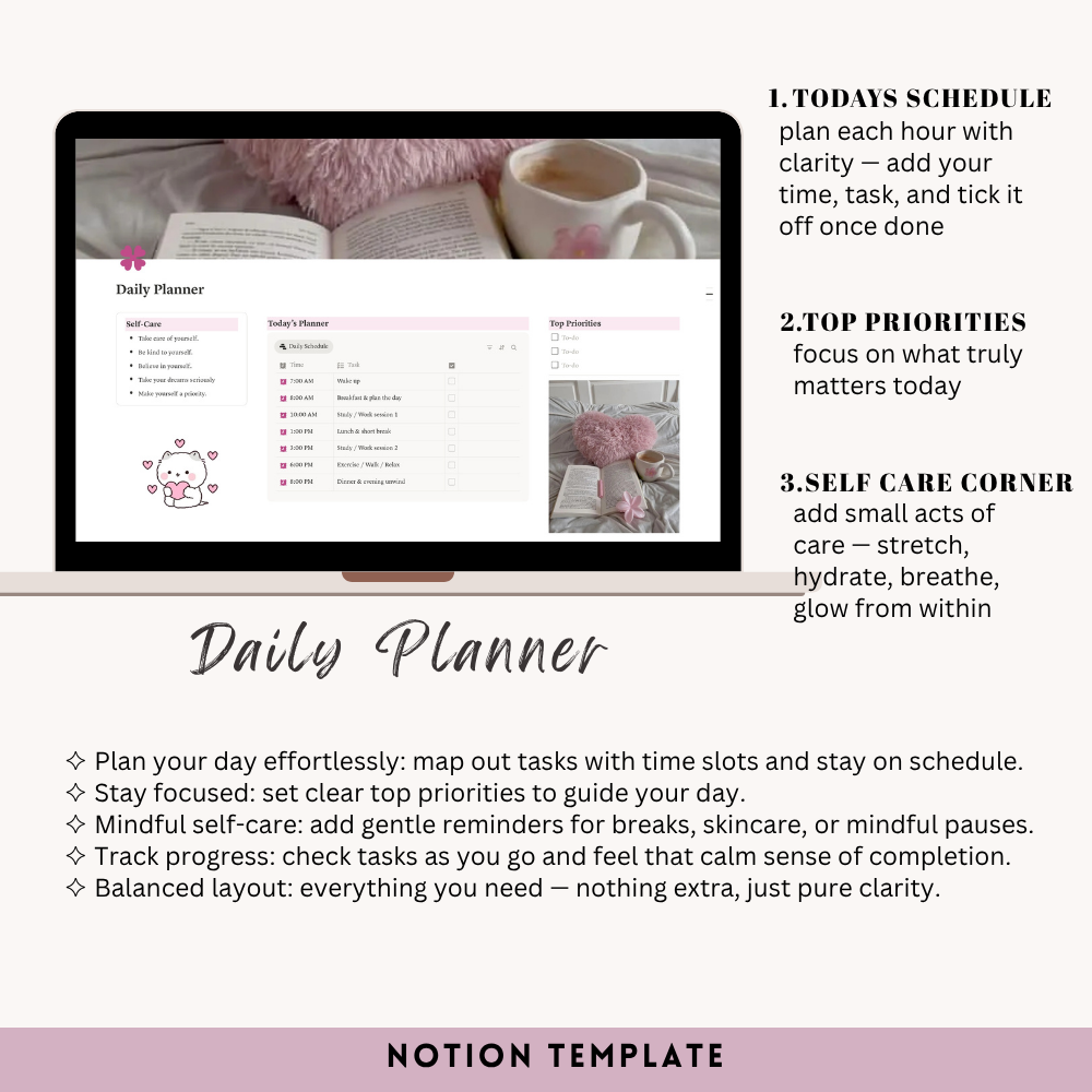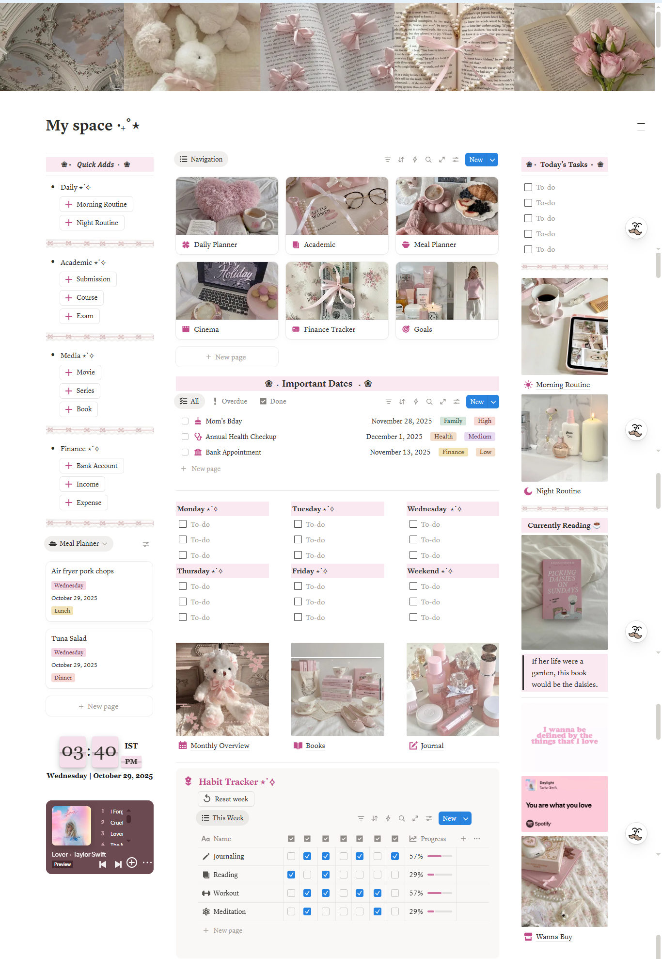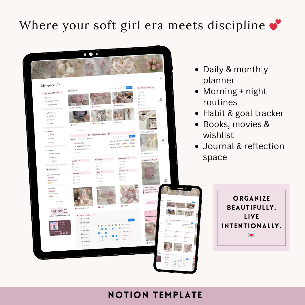 My Space Template is your personal digital sanctuary — a space to plan, reflect, and grow. It includes everything you need to stay balanced and productive: a daily planner, morning and night routine tracker, habit tracker, academic planner, goals section, meal and finance planners, book and movie logs, important dates, monthly overview, a “wanna buy” wishlist, and a cozy journal space. Designed with a clean, aesthetic layout, it helps you organize your mind, track your progress, and create a life you truly love — one page at a time.