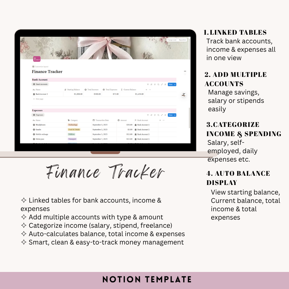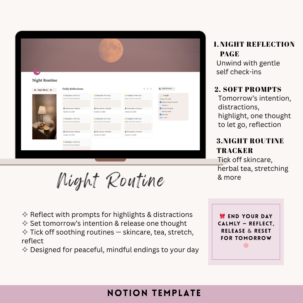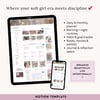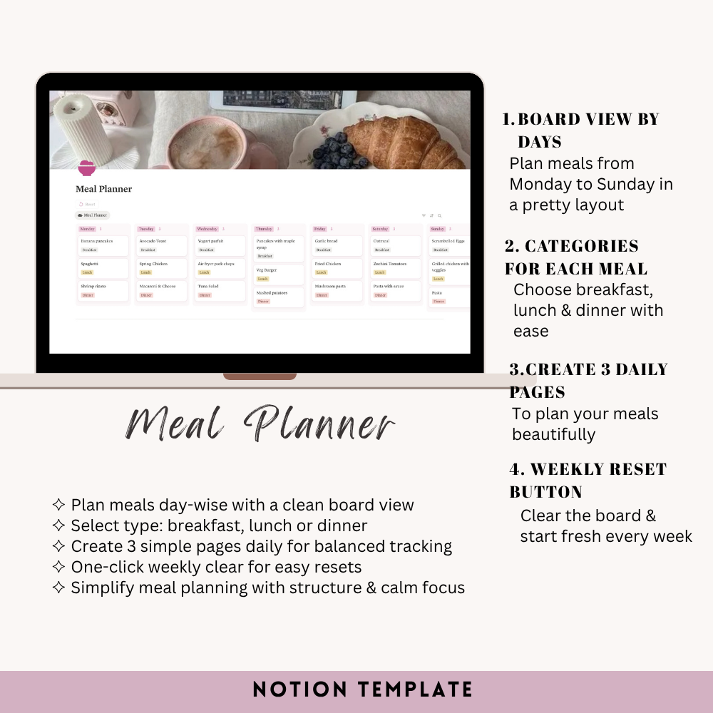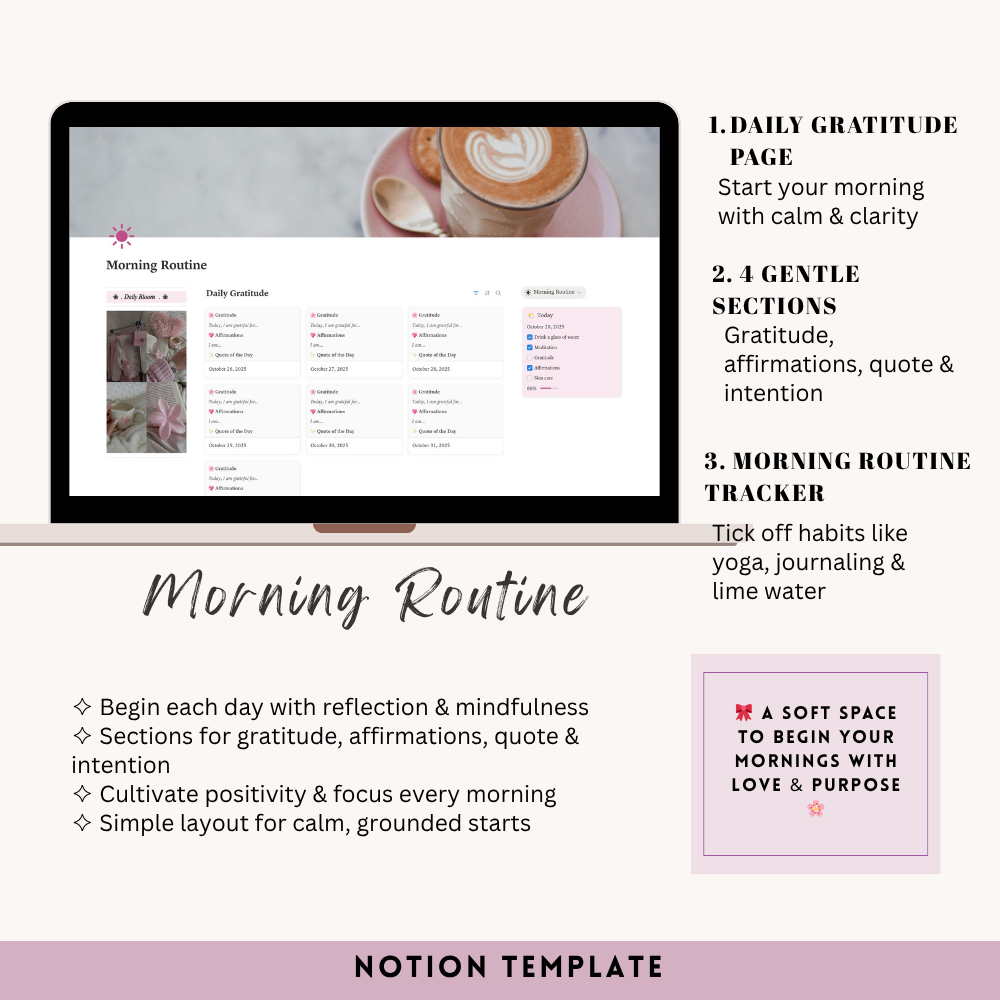 My Space Template is your personal digital sanctuary — a space to plan, reflect, and grow. It includes everything you need to stay balanced and productive: a daily planner, morning and night routine tracker, habit tracker, academic planner, goals section, meal and finance planners, book and movie logs, important dates, monthly overview, a “wanna buy” wishlist, and a cozy journal space. Designed with a clean, aesthetic layout, it helps you organize your mind, track your progress, and create a life you truly love — one page at a time.