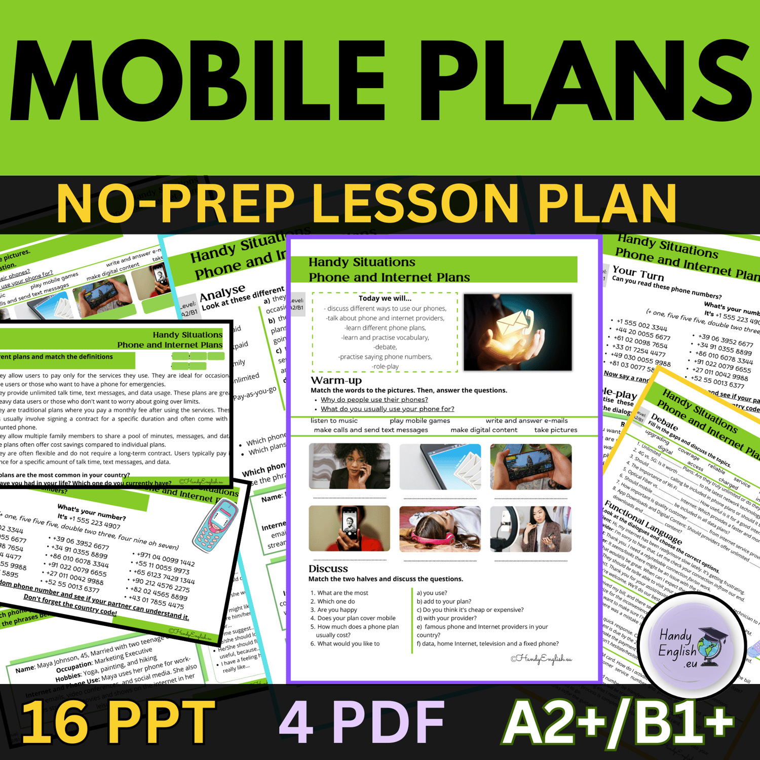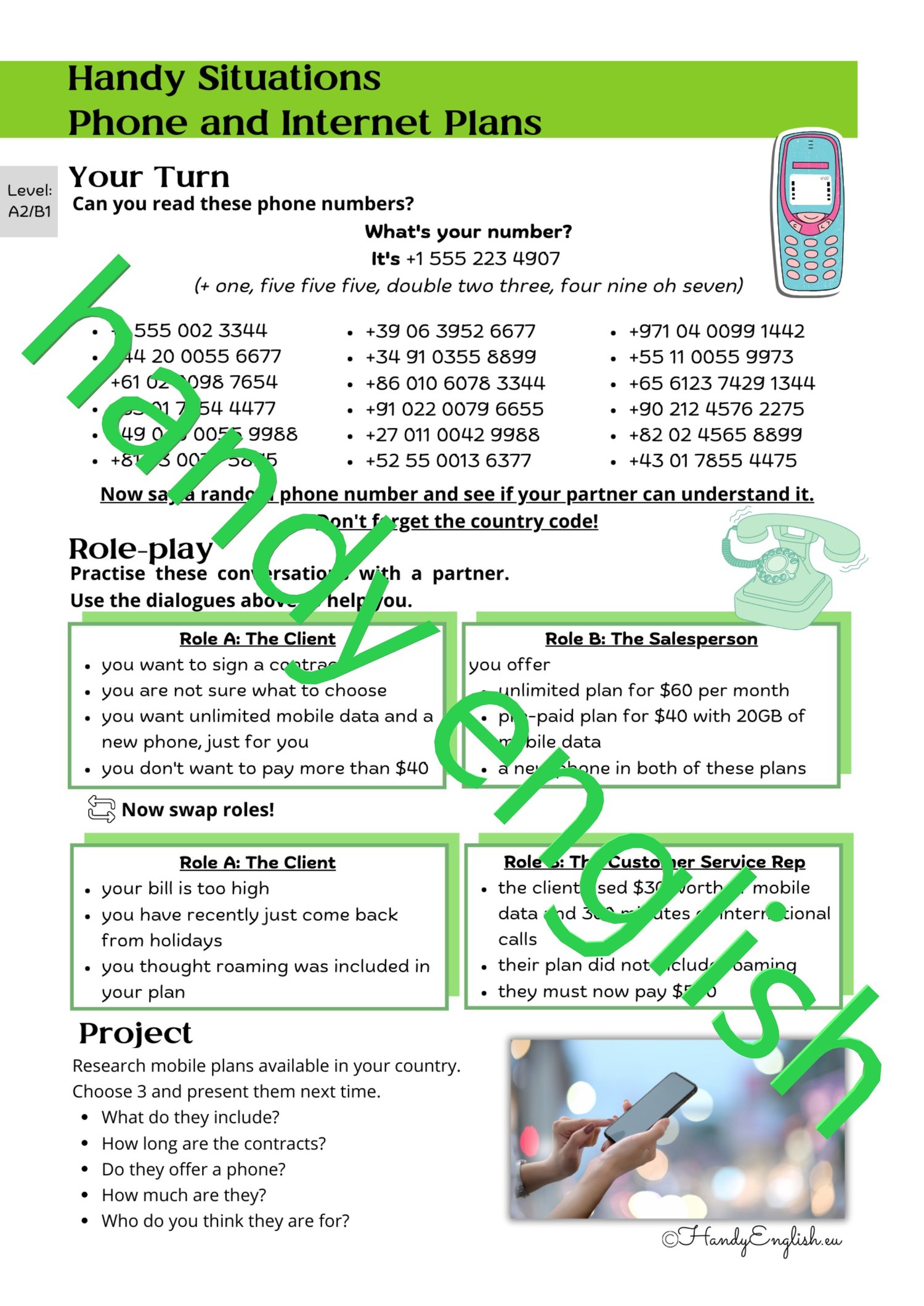 This lesson plan combines English Language Arts, ESL, ELL, mobile plans, phone numbers, choosing a phone plan, customer service, phone providers, dialogues, Functional Language, Role-Plays, speaking, projects, and research in one lesson.