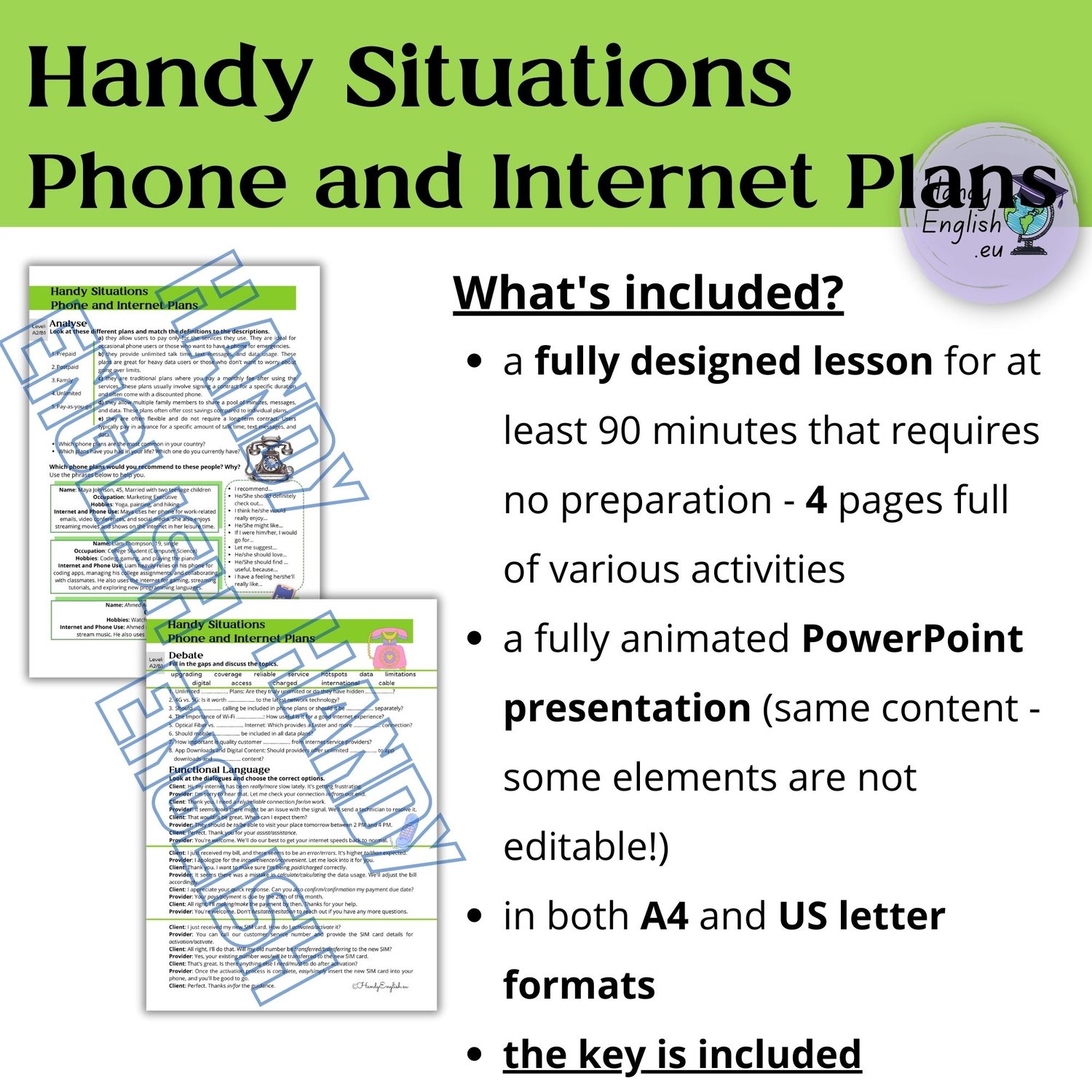 - a fully designed lesson for at least 90 minutes that requires no preparation - 4 pages full of various activities