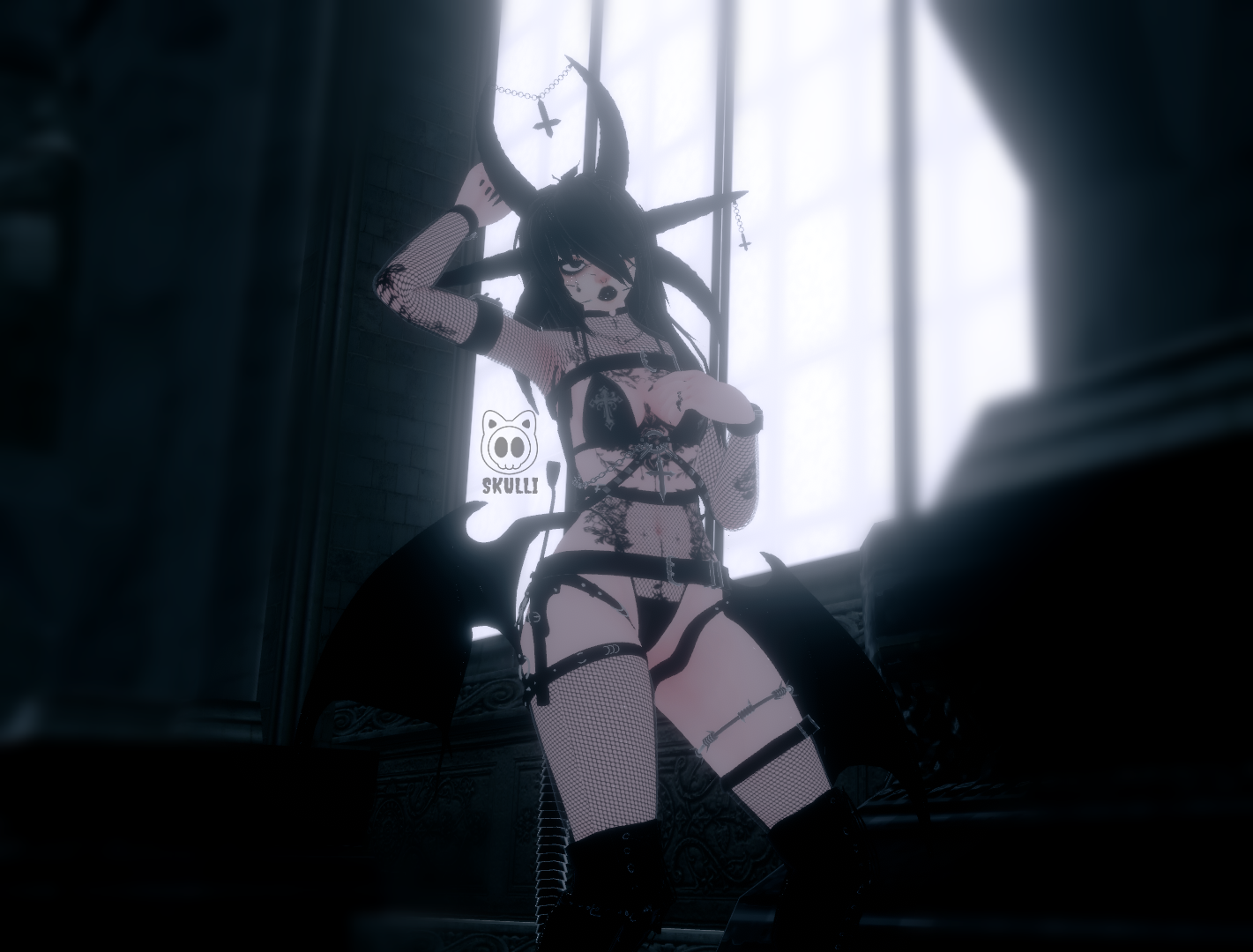 Made by me (Skulli#7154): Arm and leg fishnets, horns, knife, face texture, face piercings, nose piercing
