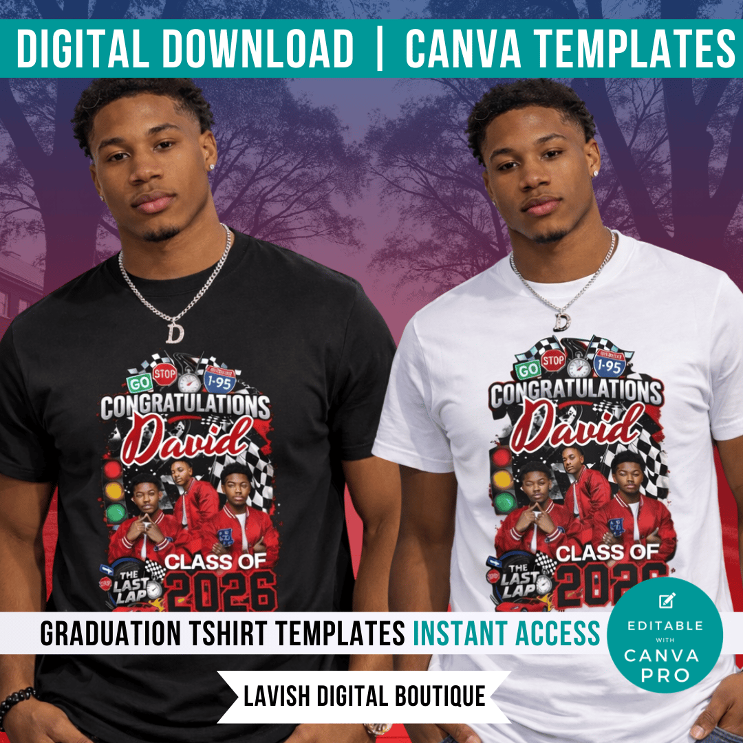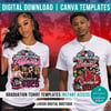 Editable Graduation Canva Pro Template designed to help you create a complete grad tshirts with ease. This includes templates for a graduation t-shirt perfect for celebrating your graduate in style. Easily customize colors, photos, names, and school details using Canva Pro to create a unique and personalized graduation look.