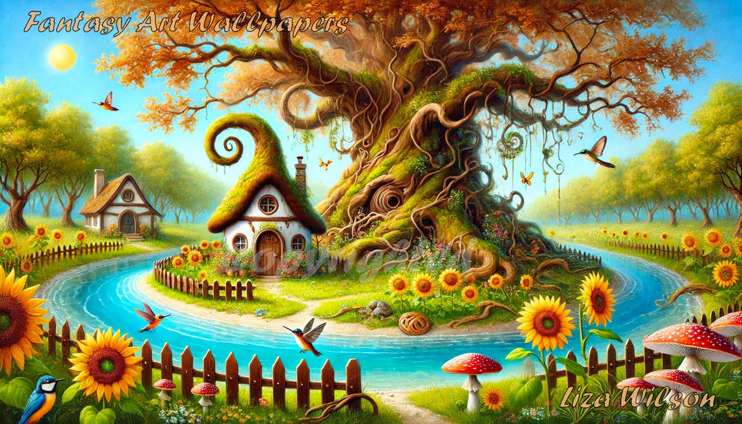 A beautiful forest scene with a large curly oak tree with auburn leaves on an island with a thatched cottage, humming birds & sunflowers.