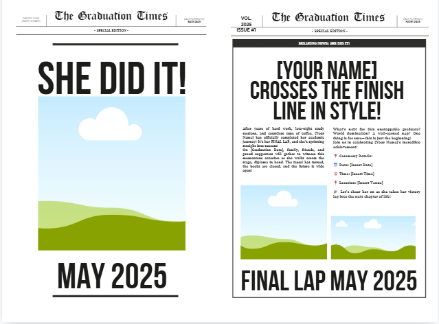 Celebrate life’s big wins with a bold, customizable newspaper-style template! Whether it’s a college graduation, nursing pinning ceremony, teacher appreciation, or even a milestone birthday—this Canva design lets you headline the moment in style.