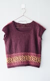 This is a top-down drop sleeve tee. A pattern detailing runs down the length of the tee on either side till the deep colour work at the hem. A 1x1 narrow rib after the colour work completes the hem. Armholes are bound off with i-cord.