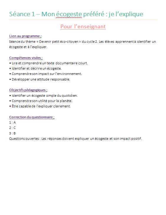 Cette sĂ©quence complĂšte de 5 sĂ©ances EDD pour le Cycle 2 permet dâaccompagner vos Ă©lĂšves dans la dĂ©couverte de lâĂ©co-citoyennetĂ© de maniĂšre simple, concrĂšte et positive.