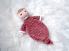This snuggler works up quickly and easily with blanket yarn or super bulky chenille velvet yarn. There is no sewing needed, as it is worked from top down in one piece. Even the lacy edging and arms are crocheted directly onto the doll.