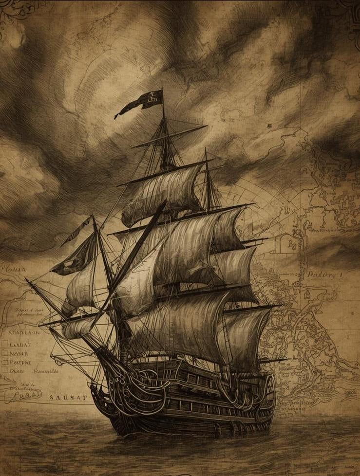 Majestatyczny żaglowiec sunący po otwartym morzu, osadzony na tle antycznej mapy, oddaje ducha podróży, wolności i odwagi.