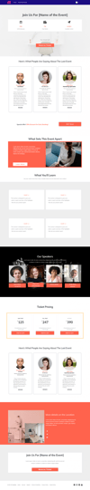 This sleek and modern website template is designed for event registration, providing essential details and encouraging participation. The main banner invites visitors to join the event, with placeholders for the event name, date, city, and location. A prominent call-to-action button encourages users to reserve their tickets.