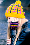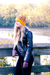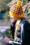 Hail, Tartania! A plaid hat is just the thing for fall, and this easy tartan method requires no stranding and produces a graphic result. The horizontal colors are knit as stripes using one color at a time per row in a wide rib, then the vertical stripes are added at the end with a crochet hook in the purl columns; no crochet skills are needed – it’s as simple as picking up dropped stitches. Mix and match your colors with the cowl and mitts for an eye-catching accessories set.