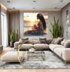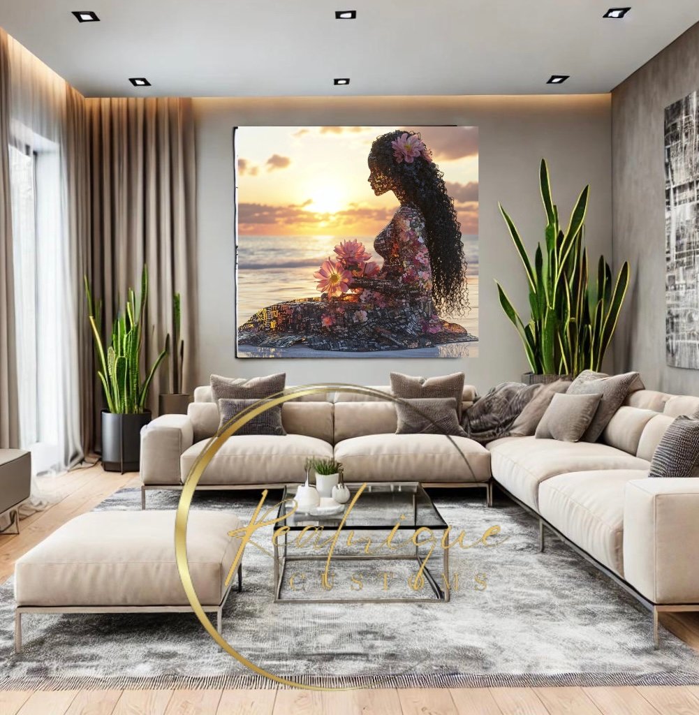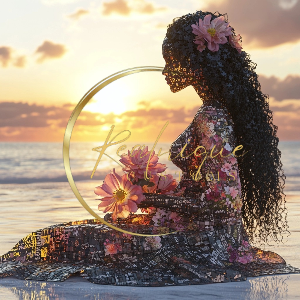 In this stunning digital composition, a serene woman meditates by the sea at sunset, her body composed of intricate puzzle-like pieces adorned with floral patterns and glowing digital codes. Her silhouette, framed by the golden light of the horizon, blends seamlessly with nature, while delicate pink flowers bloom from her hands and hair, symbolizing growth and tranquility. The fusion of organic beauty and technological elements creates a harmonious contrast, reflecting the balance between humanity and the digital world in a peaceful, dreamlike setting.
