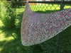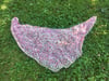 Any yarn will work with this as long as your gauge (yarn/needle combination) creates a fabric that will lay nicely across your shoulders. This pattern will work well with any speckled, gradient, solid, or semisolid colors. The pink sample was knit with Cauldron’s Path Yarns Sunrise in Pink Gradient Splash (fingering weight, 100 grams, 475 yards) and used 465 yards