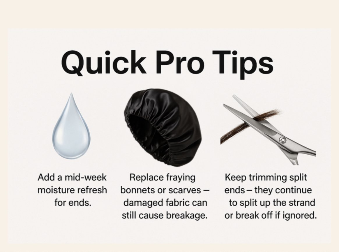 ✅ Quick-reference checklists & pro tips for moisture, trims, and protective styling