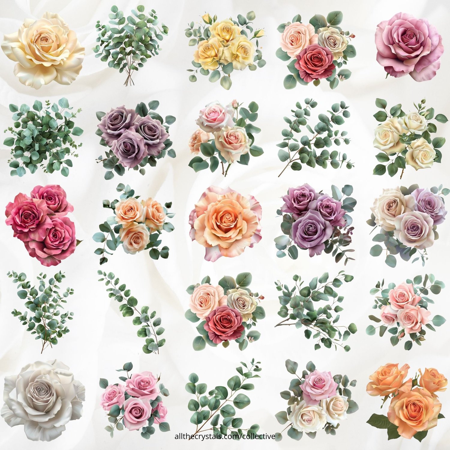 Bring the freshness of spring to your designs with our roses and eucalyptus clip art collection. These botanical illustrations are perfect for adding a natural, seasonal touch to your Mother's Day, spring, or Beltane offers and/or marketing campaigns.