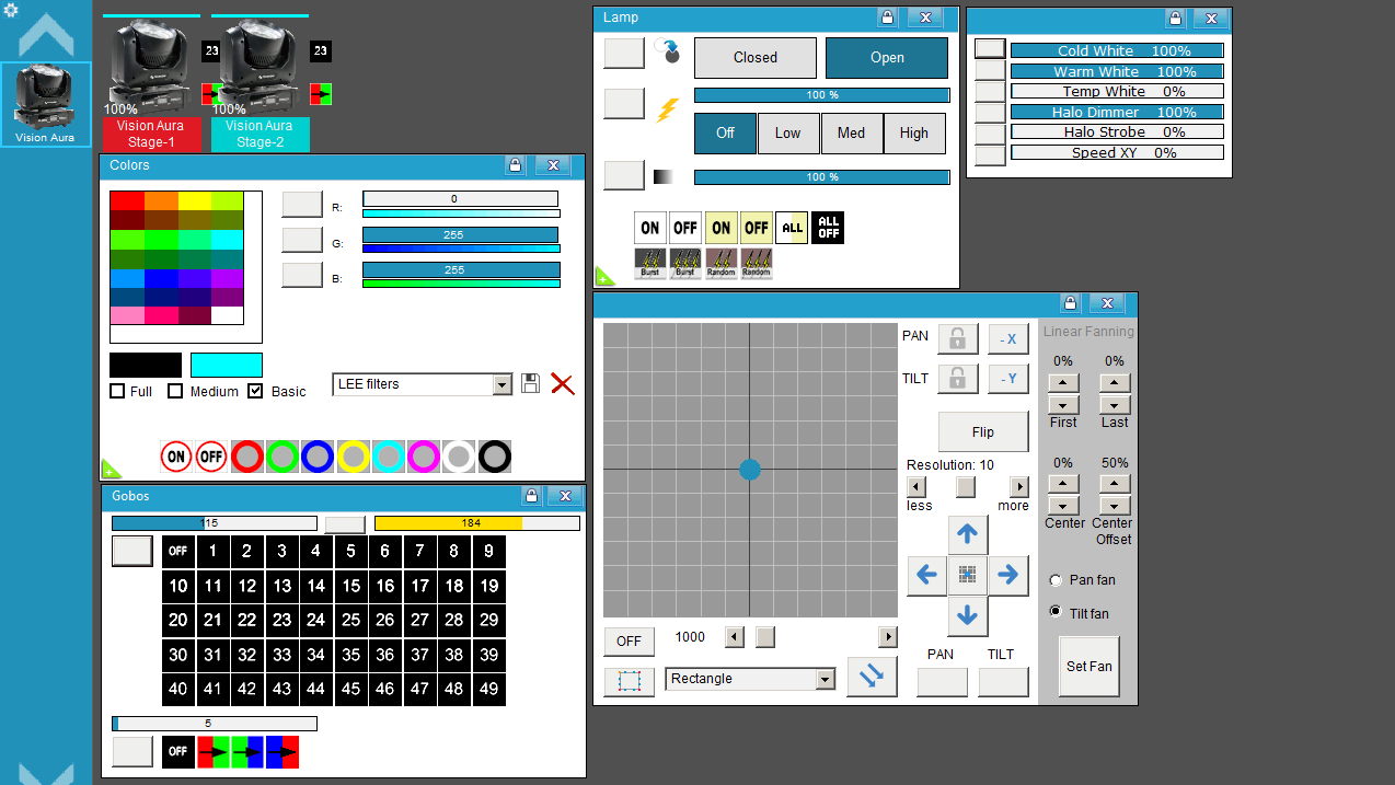 * Verifique, con el Fixture de pruebas de 20CH (click), que coincidan estos canales: 5 Dimmer, 6 Strobo / Shutter, 8 Blanco Cálido, 10 Dimmer del Halo, 14 Azul del Halo.