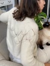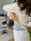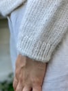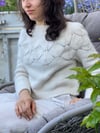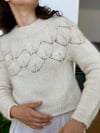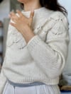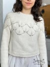 Hygge sweater is a loose fitting circular yoke sweater worked seamlessly from the top down, with radial increasing around the yoke and with elements of classic raglan increasing. Some increasing rounds are integrated into Leaf lace pattern. Pullover is cropped and has a very slightly A-silhouette. Two type of Short rows is used for a shape better fit. The yoke with a cosy lace pattern that remember on soft squishy leafs is worked first followed with few rounds of classic raglan increasing. Then sleeves are setting on hold and body of pullover is knitted. After finishing the body sleeves are taken from hold and worked top down to the cuffs.