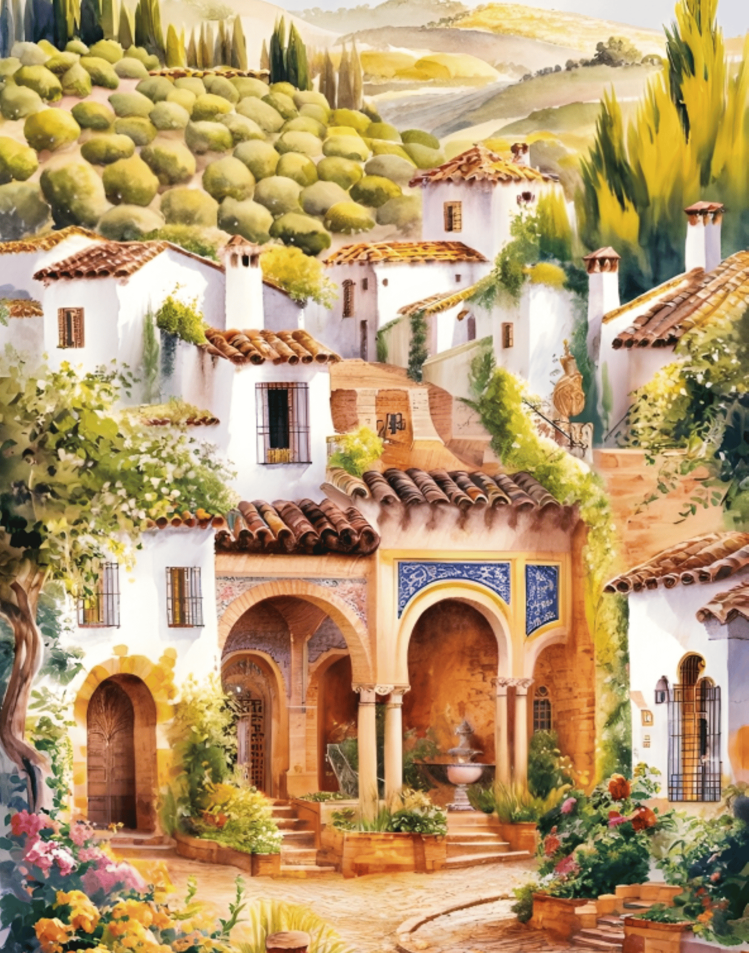 Andalusian, Mountain Landscape, Farm Art, Farmland Painting, Vintage City, Nostalgic City life, Nature, Cool Nature, Beautiful Nature, Sunrise, Natural Landscape, Wall Art, Digital Art.