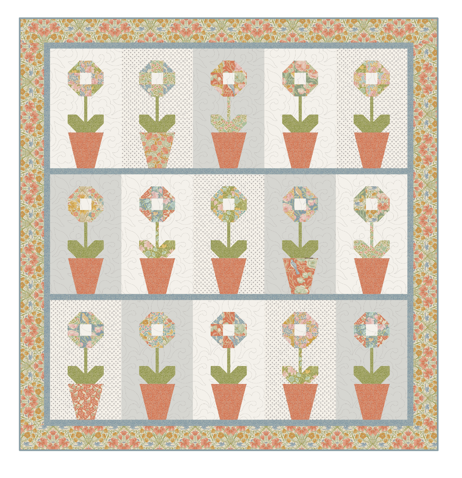 Inspired by the beautiful Auricula theatre at Calke Abbey - built in 1830 - this quilt will allow you to enjoy these elegant little flowers all year long…