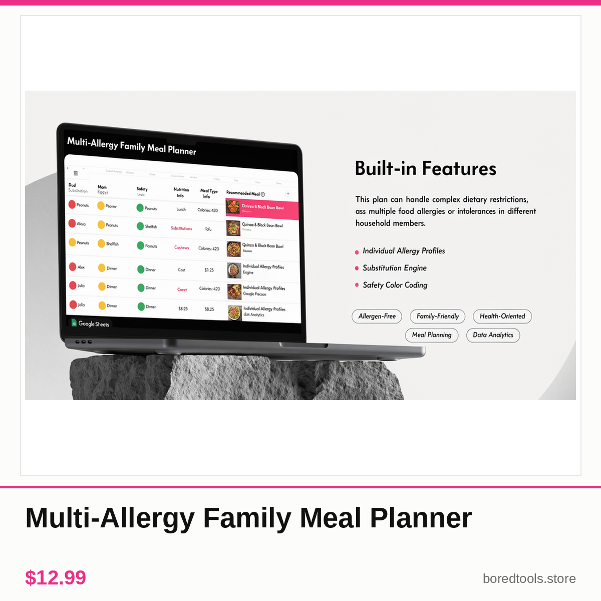 Managing one food allergy is hard. Managing four or five across different family members turns meal planning into a daily puzzle with stakes. This spreadsheet is built for families where one kid is nut-free, one is gluten-free, one can't touch dairy, and dinner still has to land at 6pm.