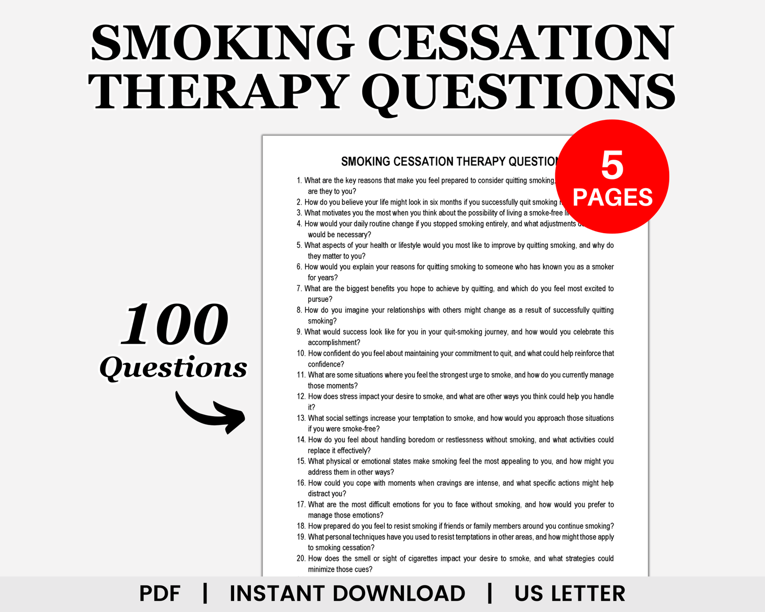 Designed to enhance client engagement and drive positive change, this therapy resource offers a collection of smoking cessation therapy questions. Tailored to the principles of nicotine addiction, these therapy questions will guide your sessions towards productive conversations and transformative outcomes. These quit smoking questions are made to elicit insightful responses and encourage clients to explore their goals and aspirations.