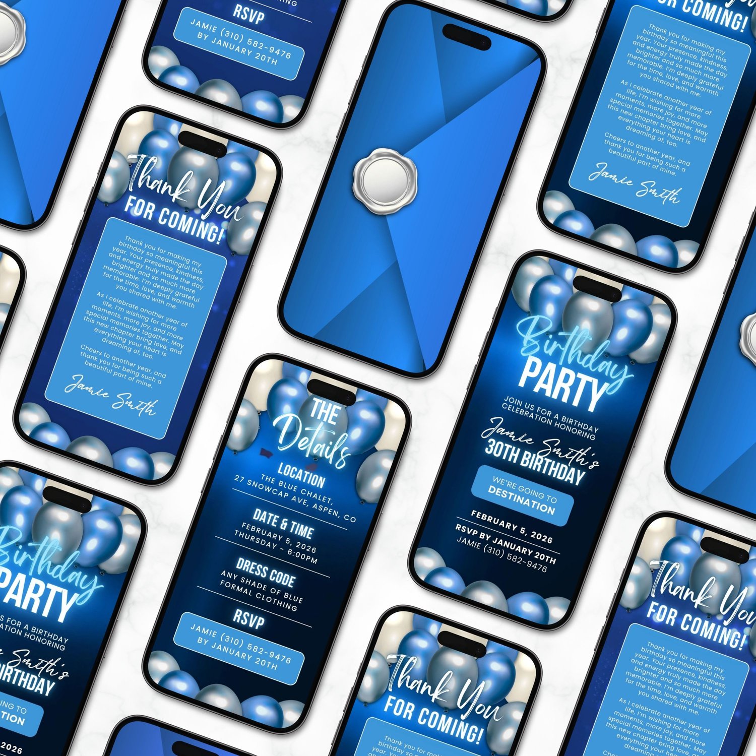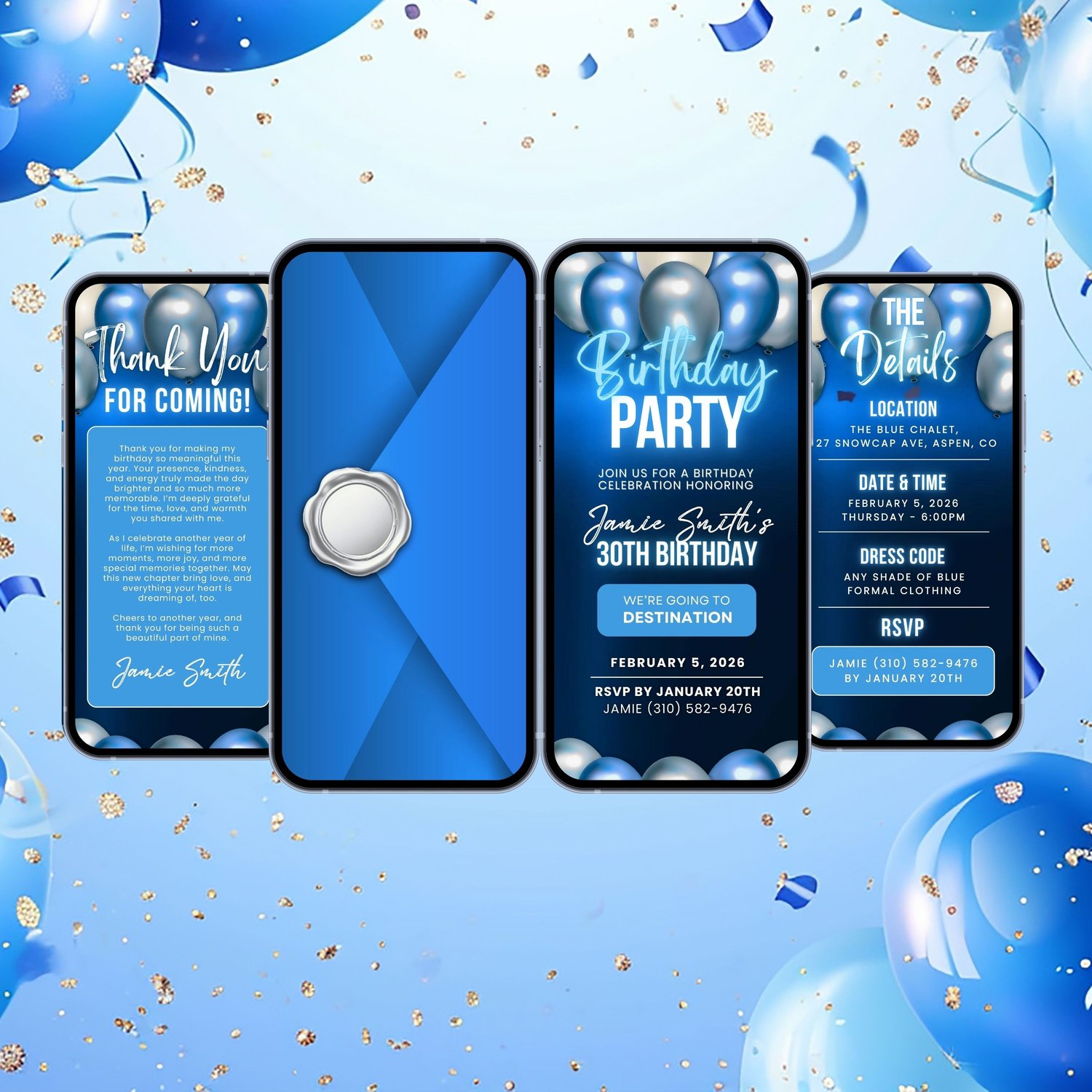 Blue Birthday Party Invitation, Balloons Birthday Invite For Men, Women, Kids, or Milestone Celebrations (Animated Canva Video Invitation)