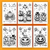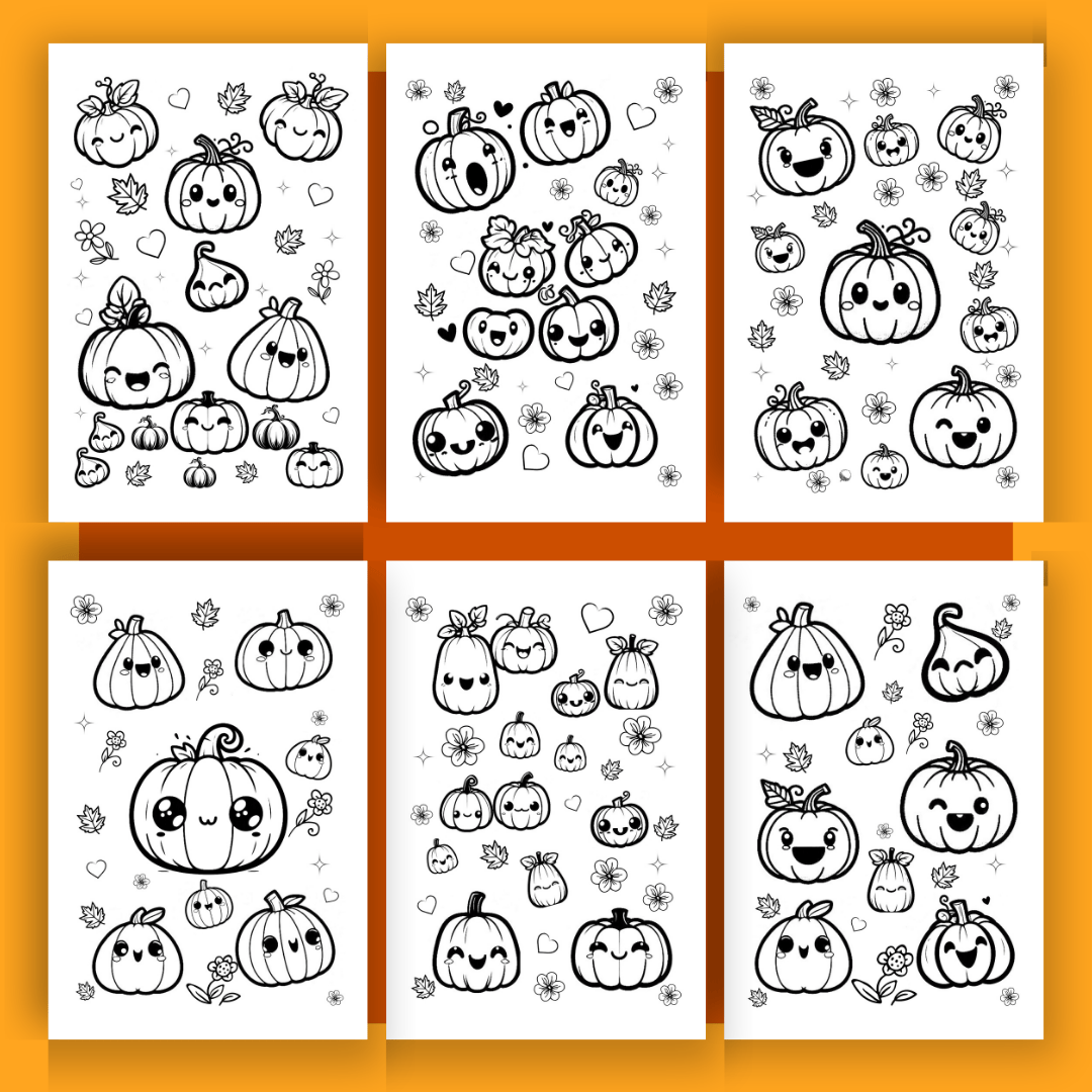 A PDF coloring book with 25 pumpkin coloring pages.