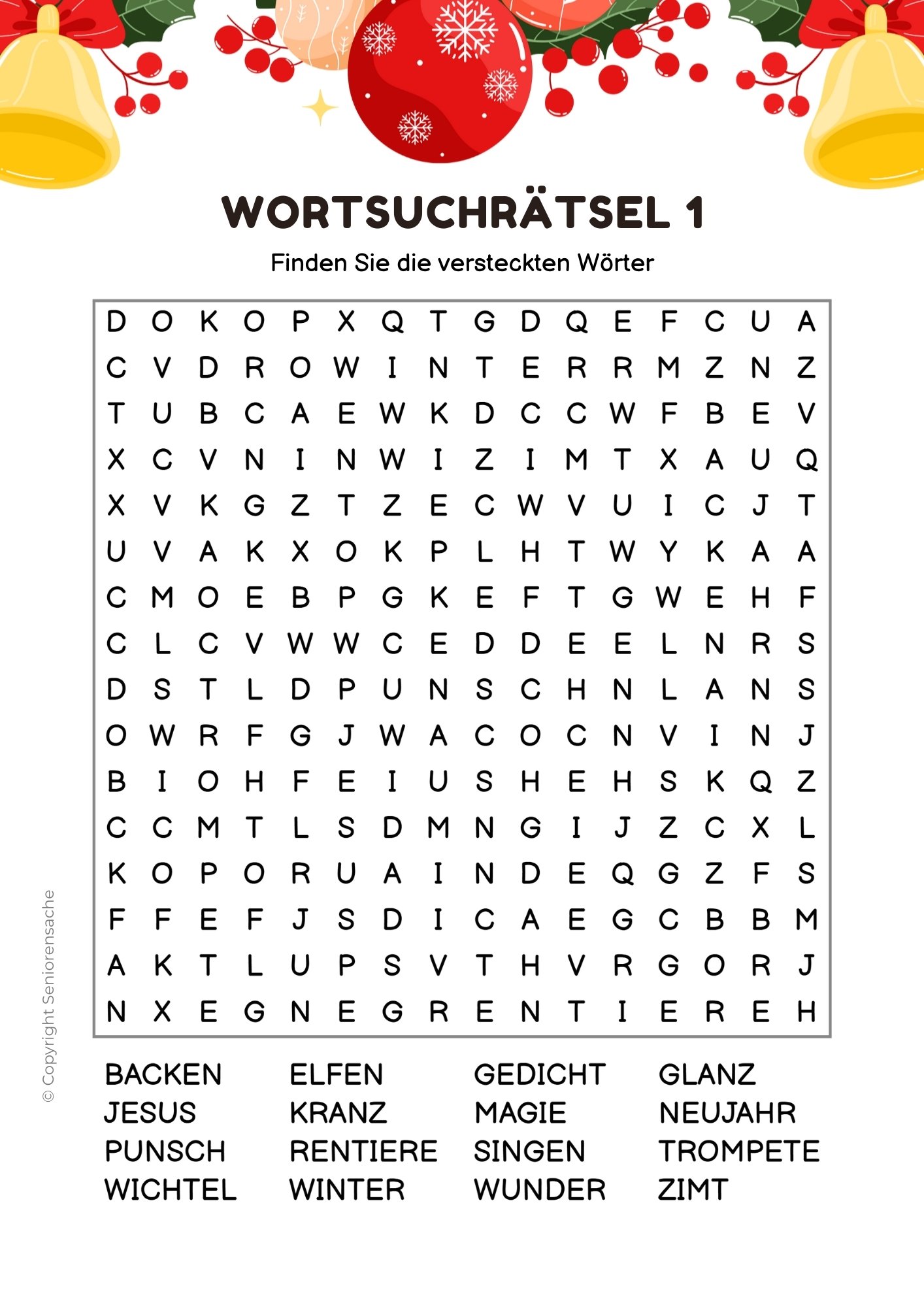 Perfekt als Beschäftigung in der Adventszeit, zum gemütlichen Rätseln allein oder gemeinsam in der Familie. Jetzt herunterladen, ausdrucken und die Weihnachtszeit mit Freude und geistiger Aktivität bereichern!
