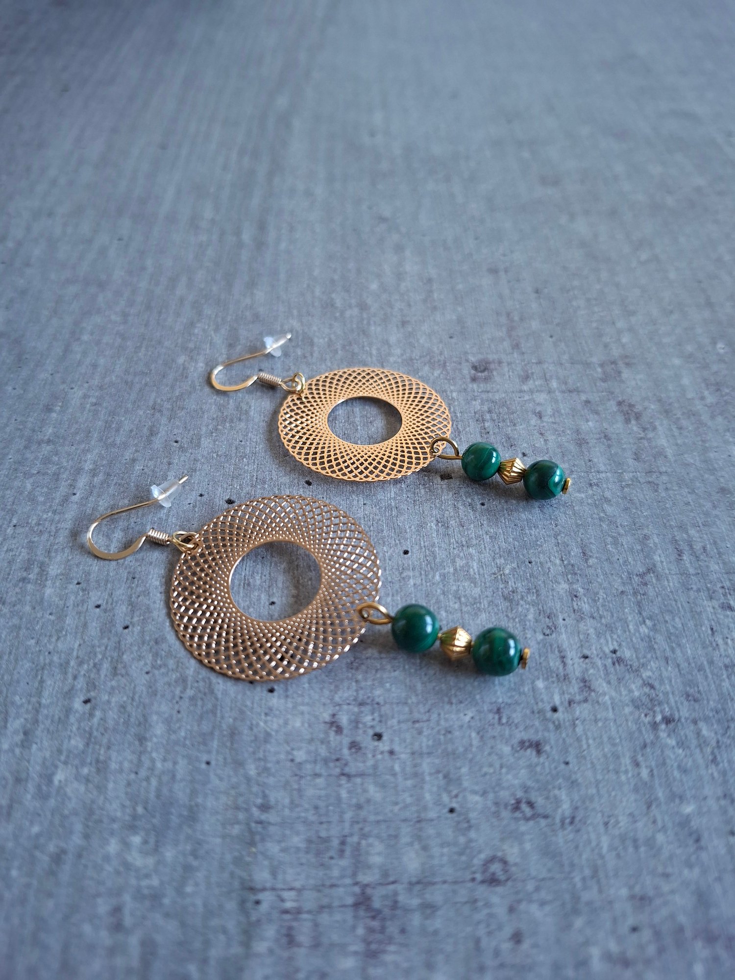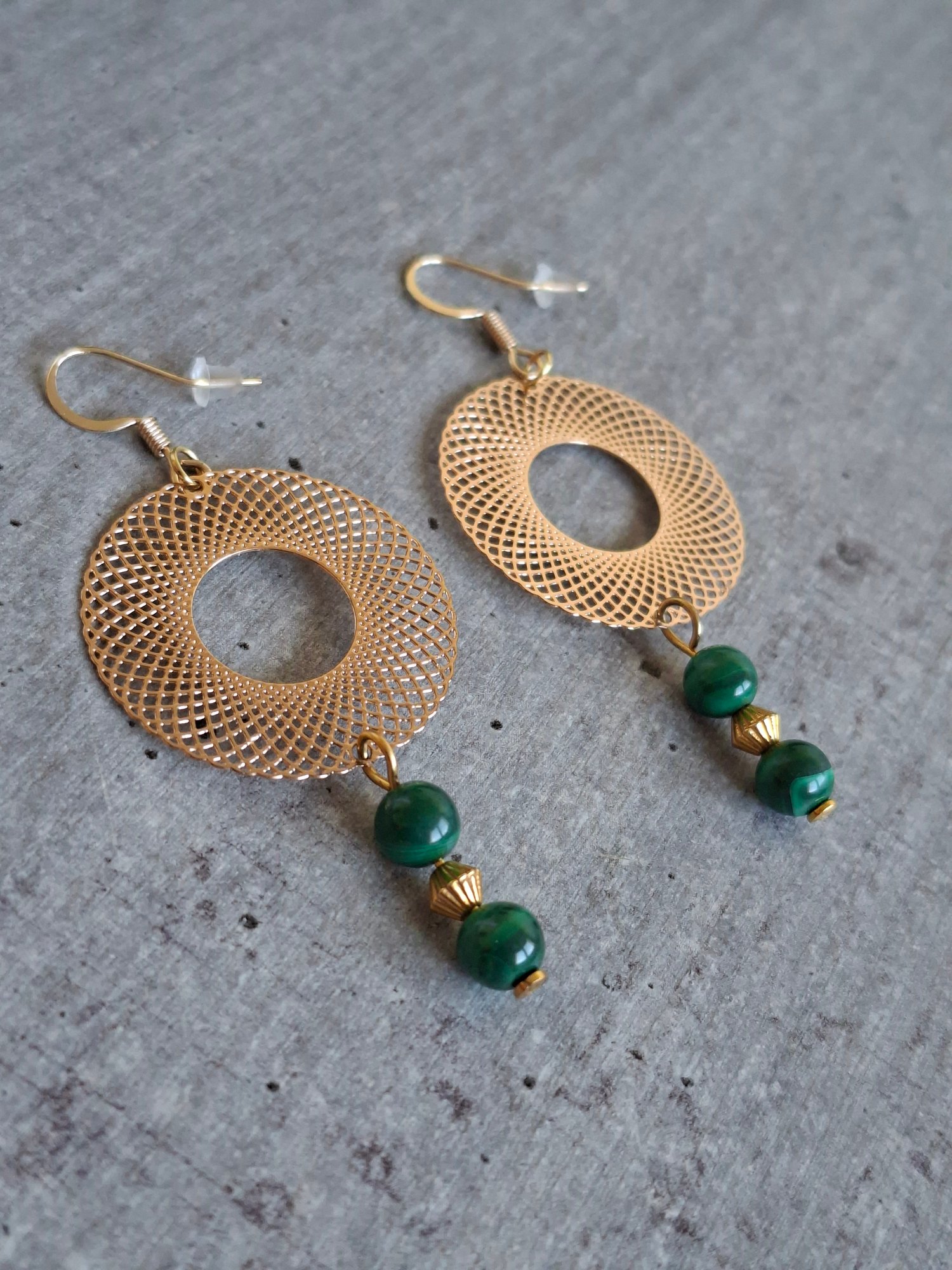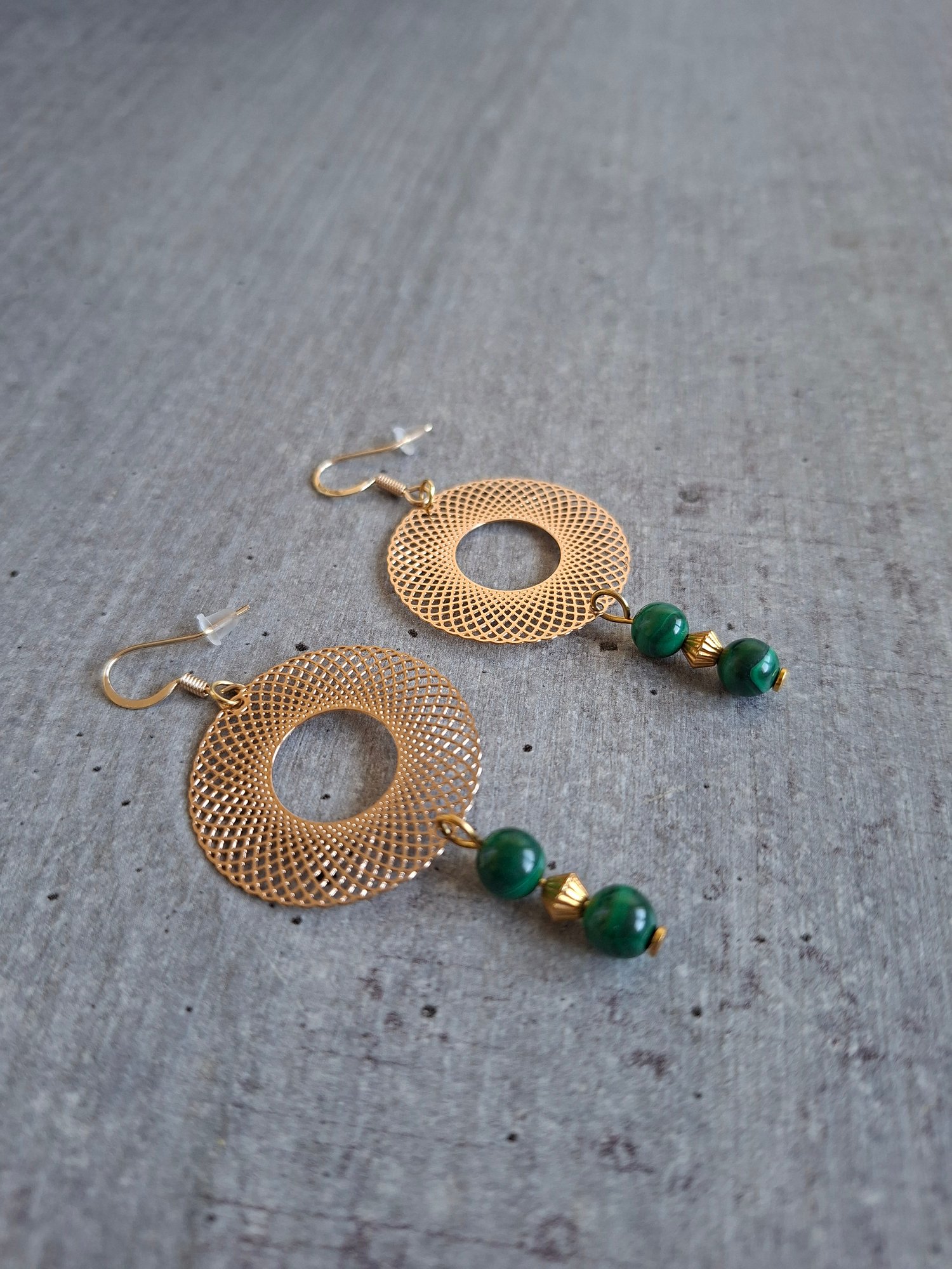 Des boucles d’oreilles raffinées et vibrantes qui associent la force de la malachite et l’élégance de motifs dorés ajourés. Leur design lumineux et harmonieux en fait des alliées parfaites pour sublimer ton style tout en bénéficiant de l’énergie protectrice des pierres.