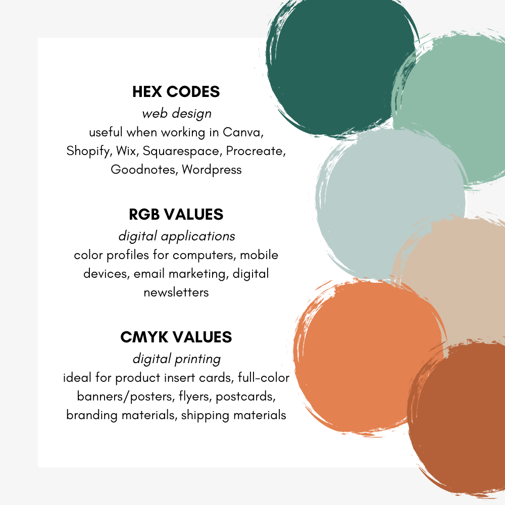 + Detailed Hex Codes, RGB, and CMYK values for each color